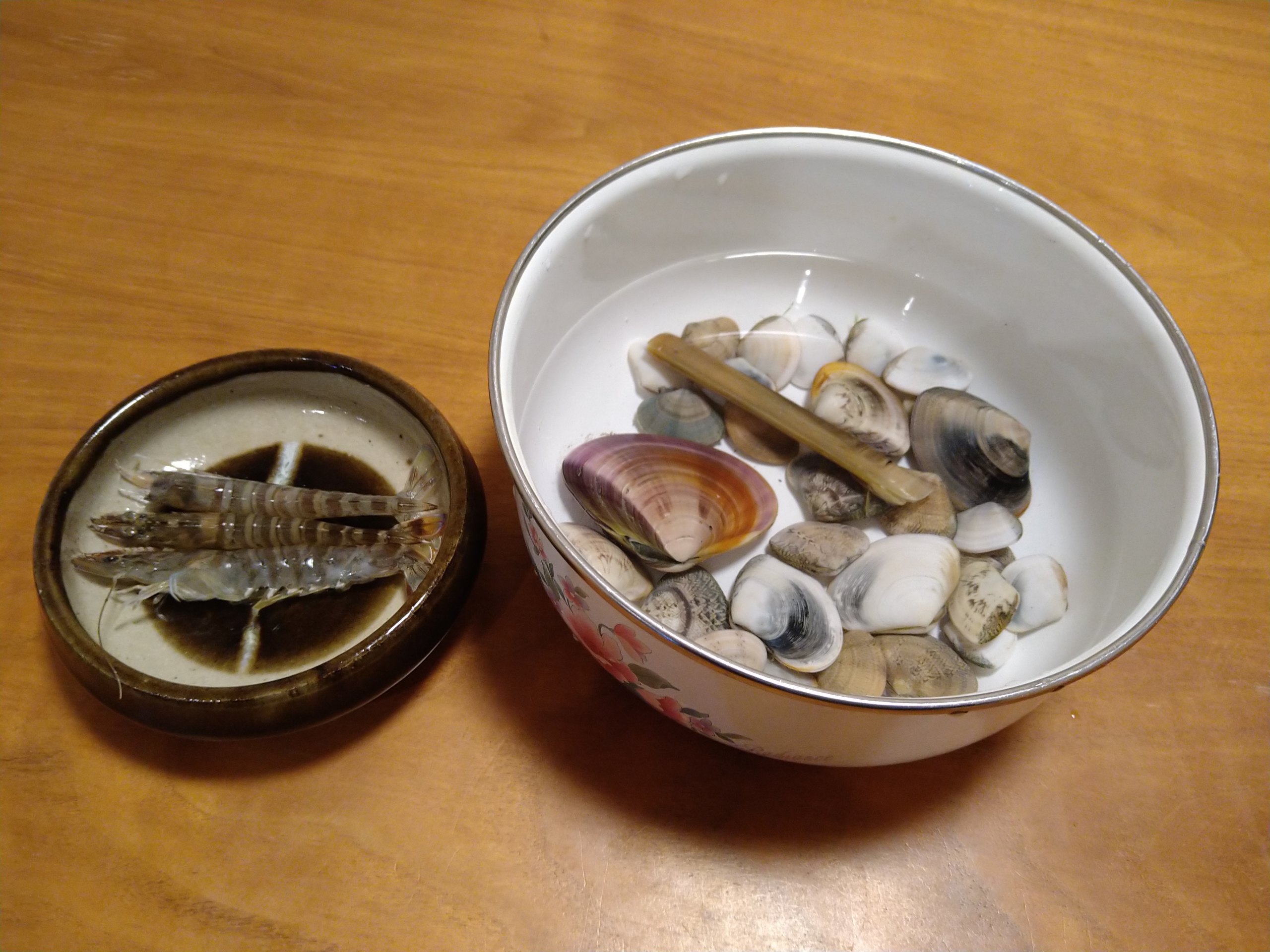 マテ貝は1つだけですが、他に小振りのクルマエビ3匹にハマグリと小玉貝が採れました。