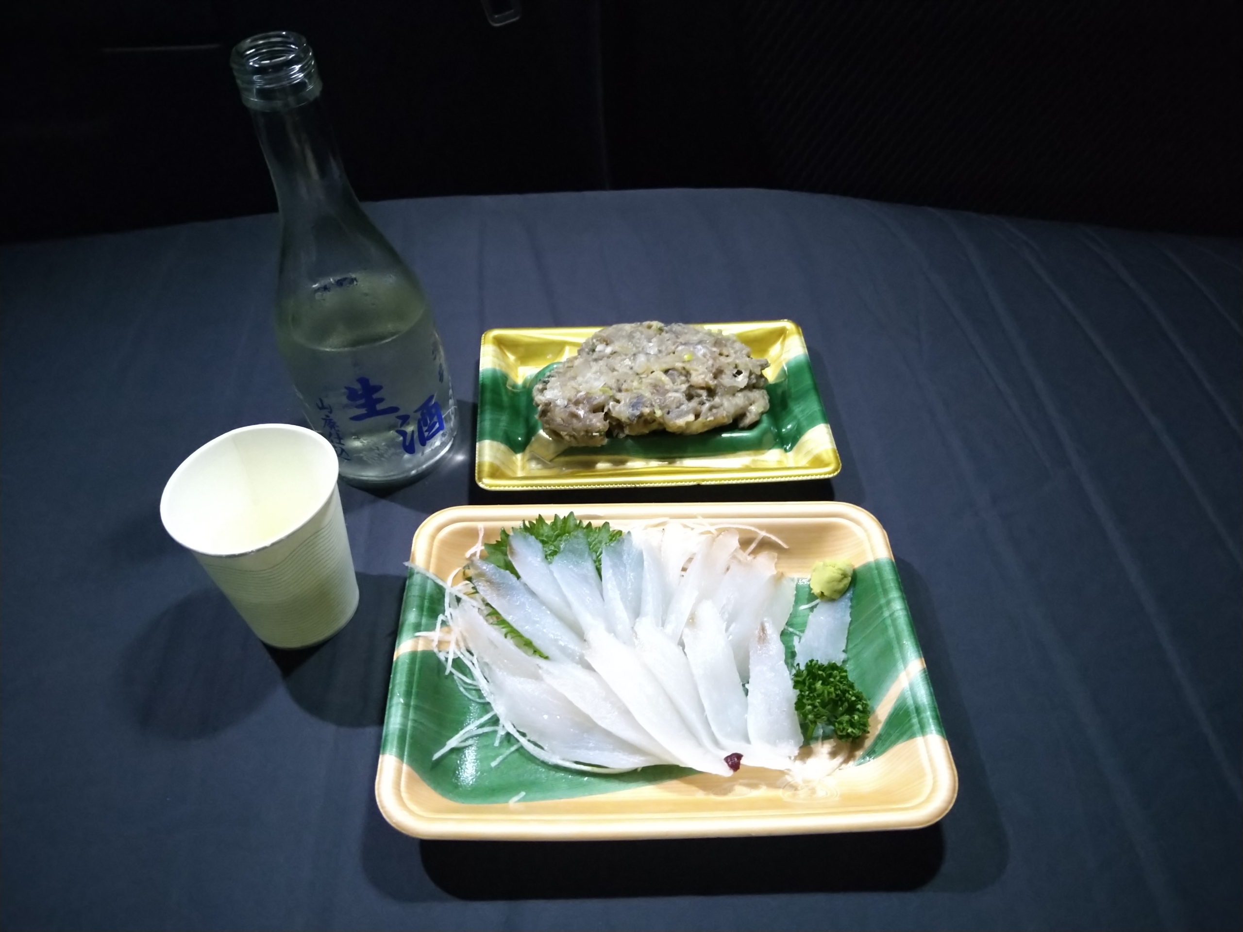車中泊での晩酌!千葉地酒・岩の井の山廃生酒と肴は睦沢町の鮮魚店・魚やで買った地物千葉県の刺身!
