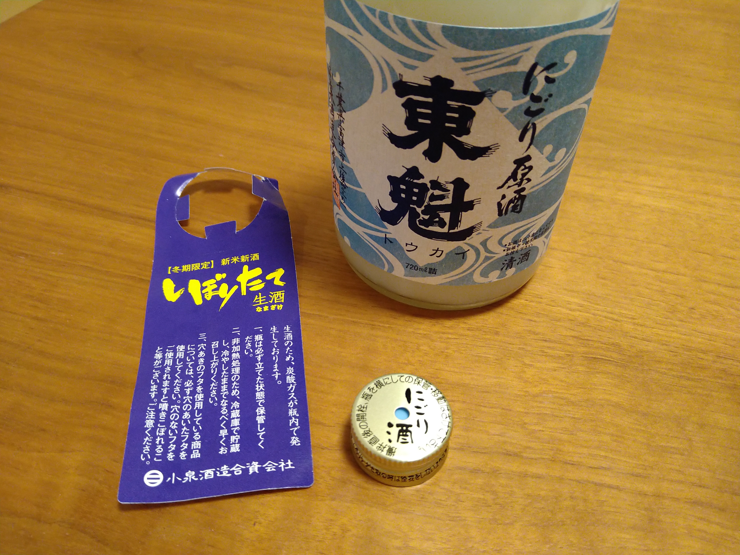 今日は千葉県富津市の小泉酒造の直売所・酒匠の館で1760円で購入した酒「東魁 にごり原酒」を冷やして飲みました。この酒、あまりラベルを詳しく見ないで買って、家でじっくりと見たら原材料名の最後に「糖類」の文字が・・・ 糖添酒のにごり原酒で値段が1760円は高すぎですね!原料米は精米歩合70%に磨いた千葉県産米を100%使用していてアルコール度数は19度です。