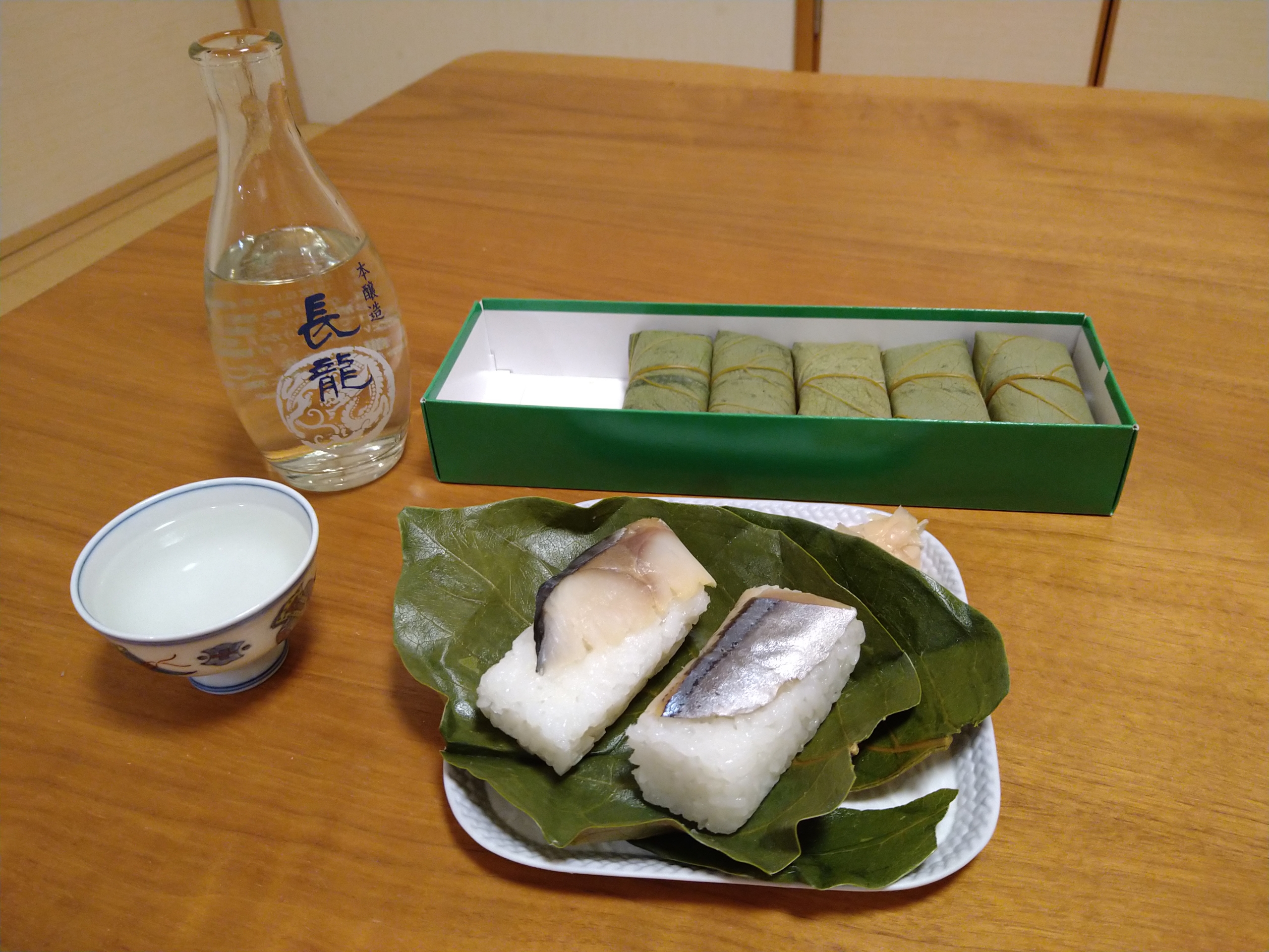 奈良地酒・長龍の本醸造のお燗壜と肴は奈良県の名産品・柿の葉寿司