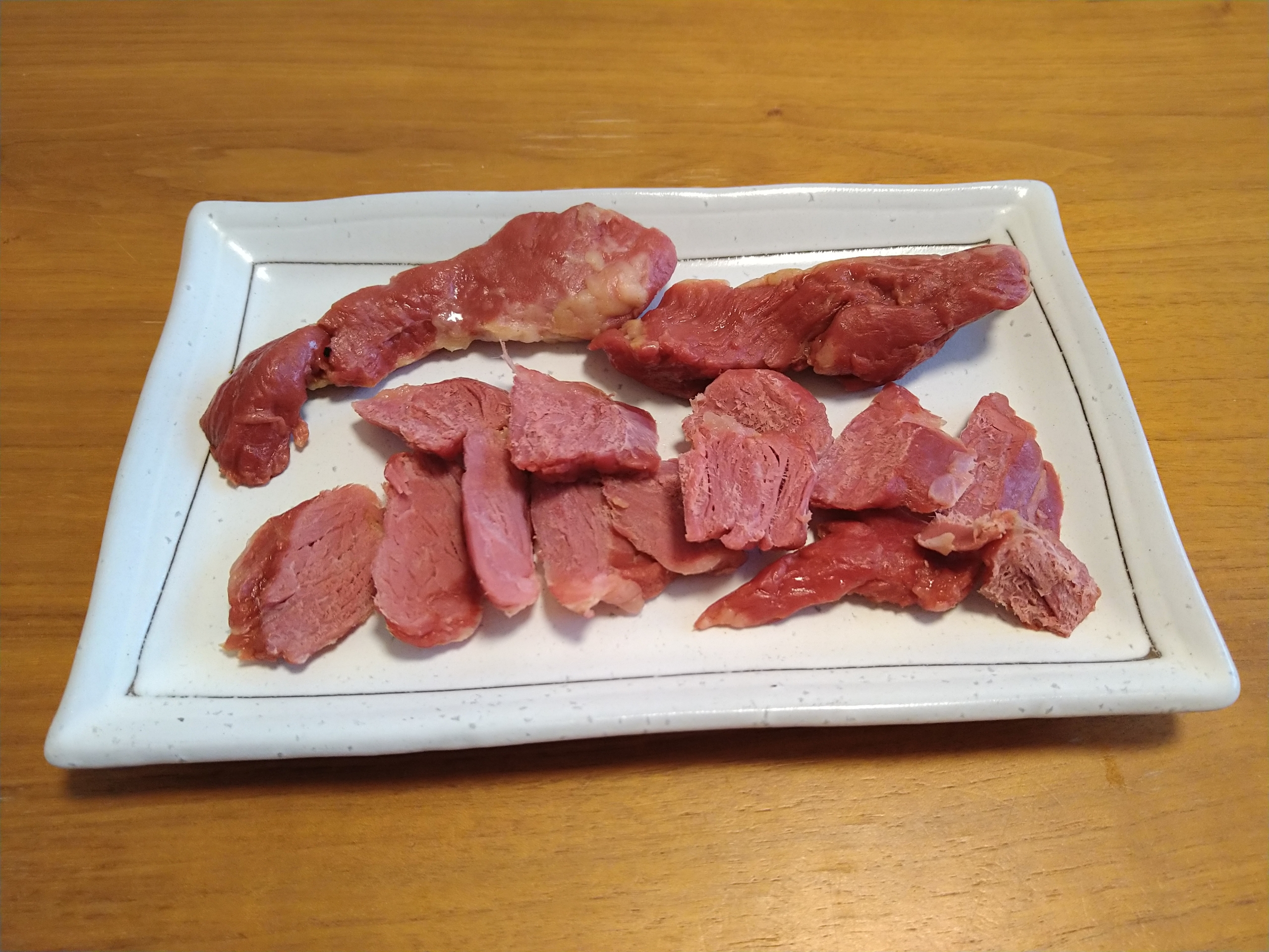 袋ごと軽く湯煎して温めて頂きます。この田園ハムは豚ハラミの燻製で厳密には肉と言うより横隔膜なのでホルモンです。食べた感想はちょうど良い塩味で脂もしつこくなく噛めば旨味が強くメチャ美味しくて驚き!値段もお手頃やしまた買おうと思います。
