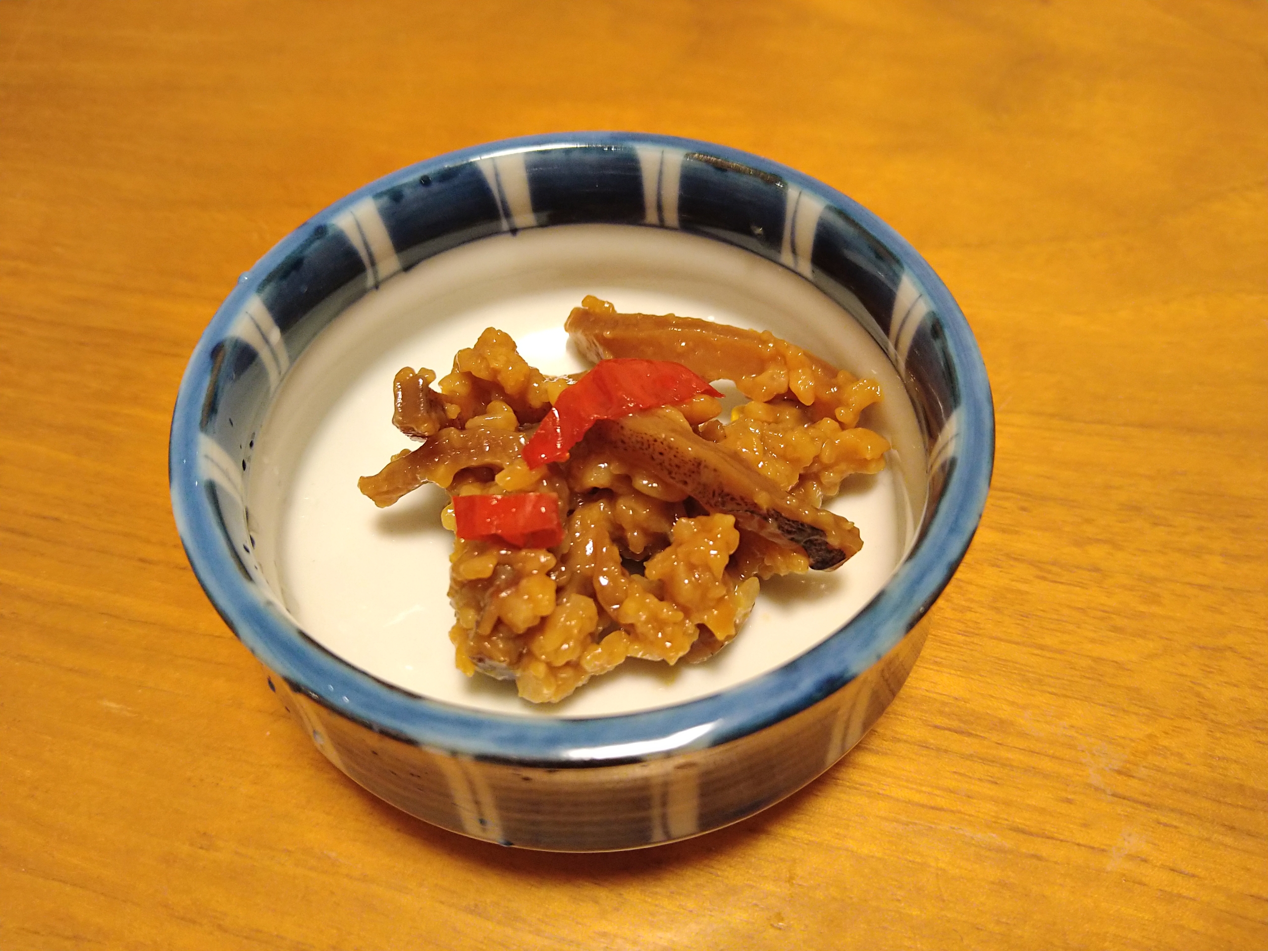 但馬産米で作った米麹をふんだんに使った麹漬でスルメイカより麹の割合が多いです。食べた感想は米麹の甘みにスルメの旨味がマッチして、ほど良い醤油味でメチャ美味しく酒に良く合いますね。熱々ご飯にのせて食べても美味しかったです。