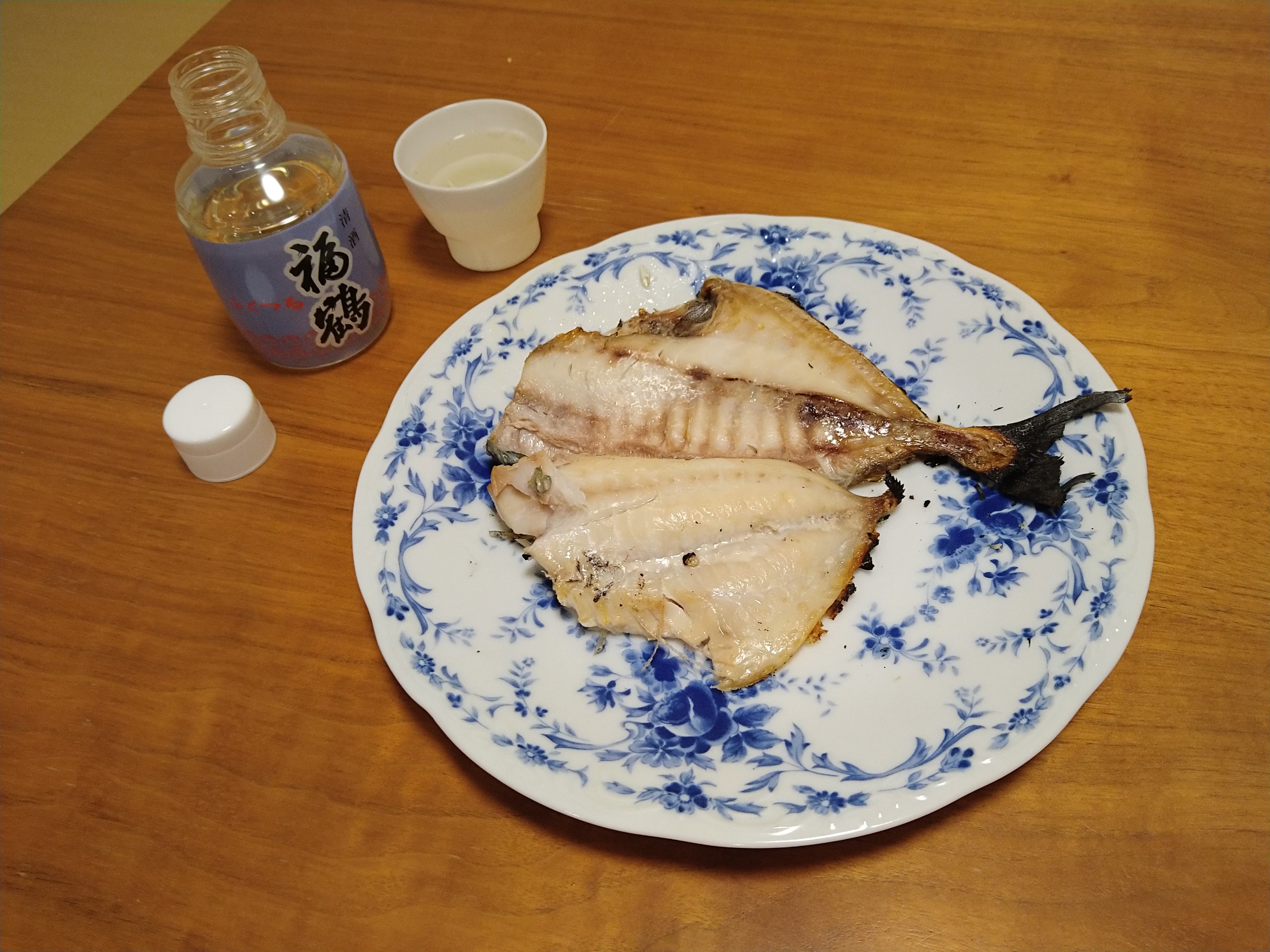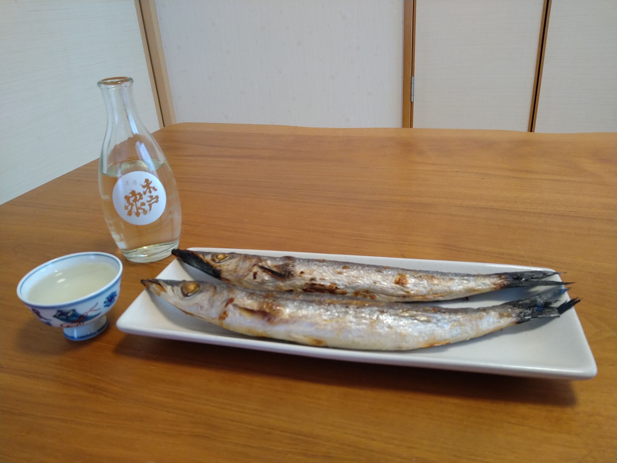 千葉地酒・木戸泉のお燗壜と肴は千葉県産のカマス丸干し