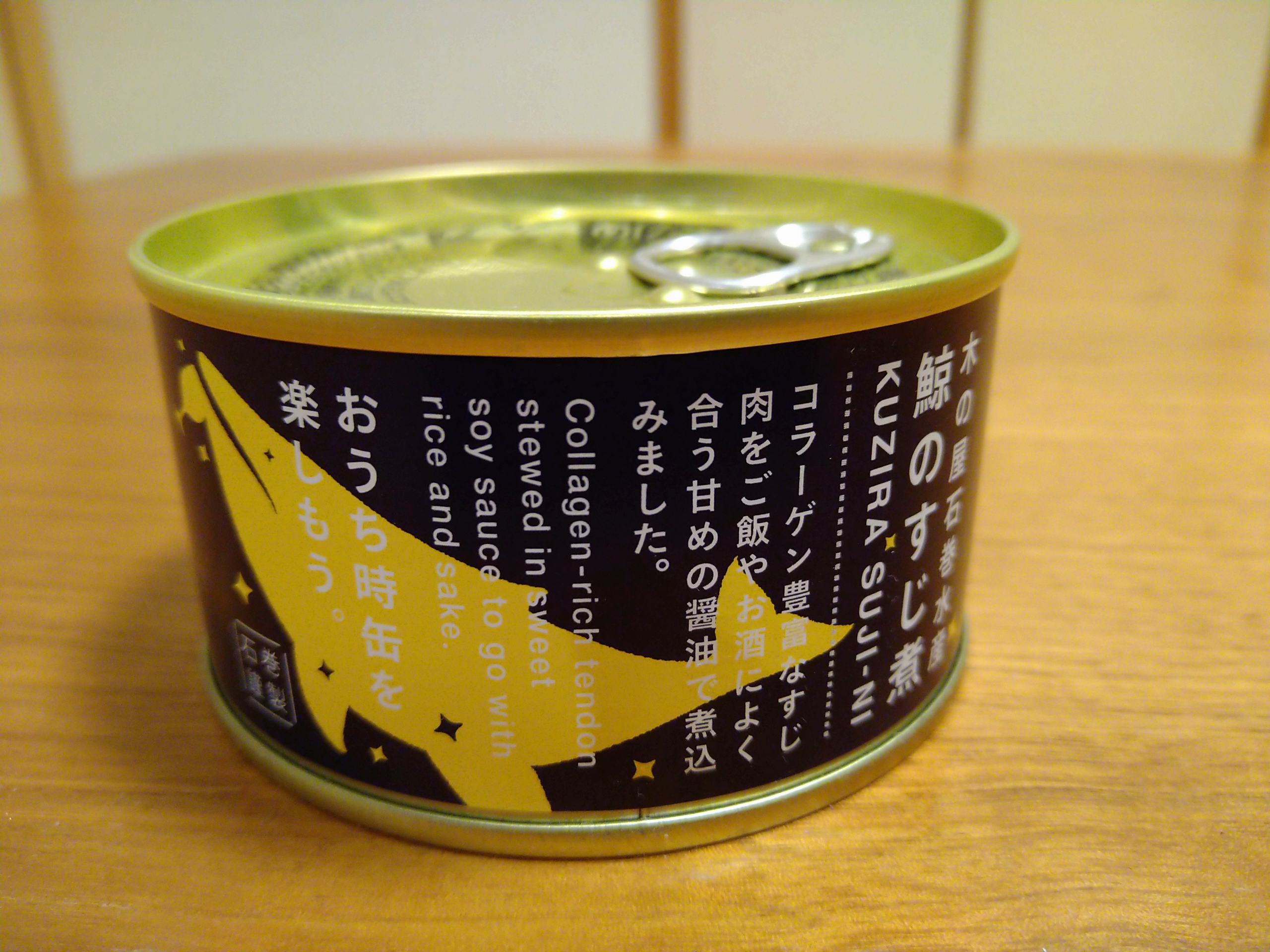 今日の酒の肴は宮城県石巻市の木の屋石巻水産が製造する国産ニタリ鯨で作った鯨のすじ煮の缶詰です。