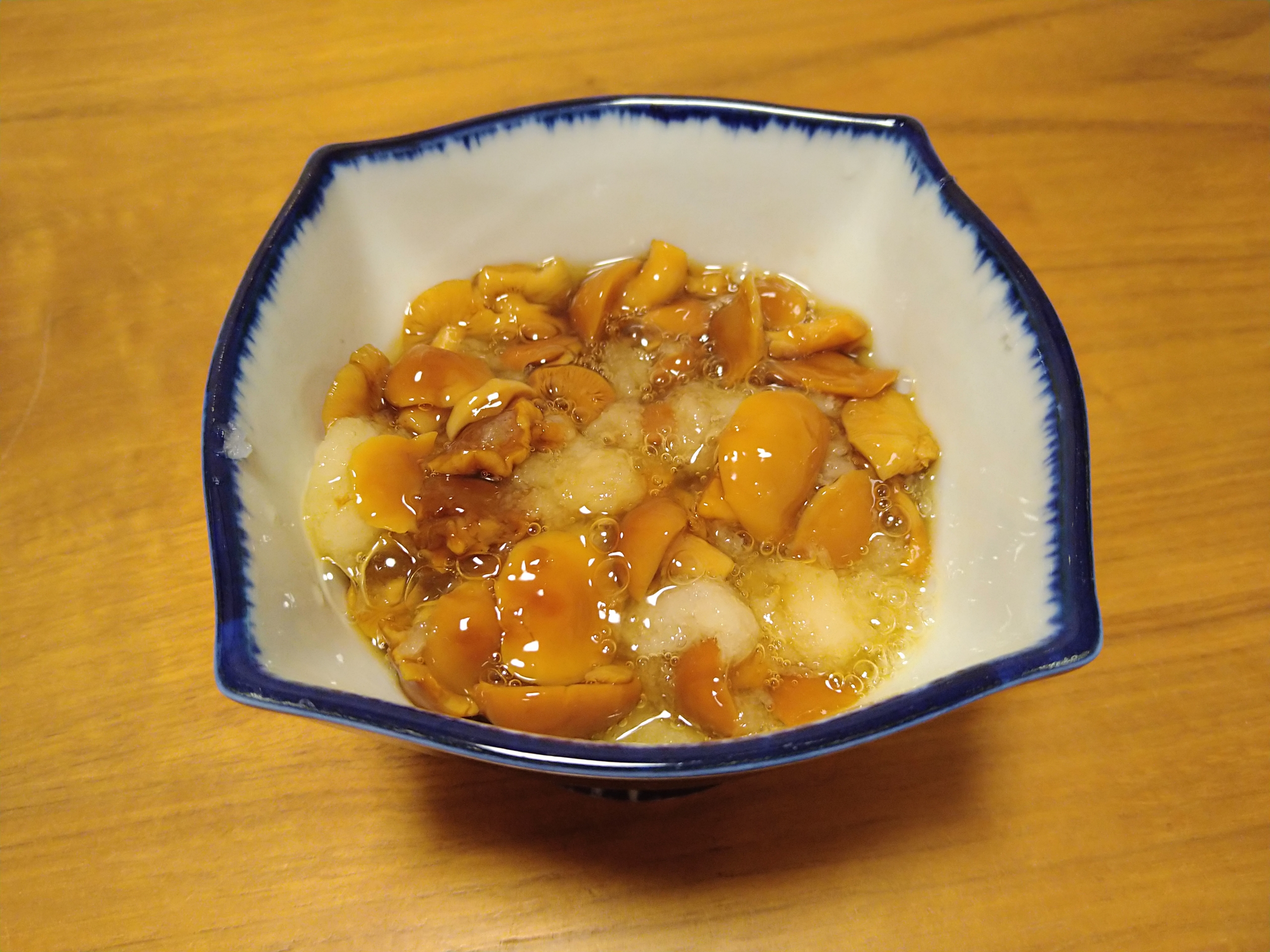 水煮状態で缶詰に入っていますが、軽く湯通しして大根おろしとポン酢で和えてなめこおろしにしました。食べた感想はぬめりが強いがサッパリとしていて、なめこ・大根おろし・ポン酢の相性が良くとても美味しく酒が進みます。