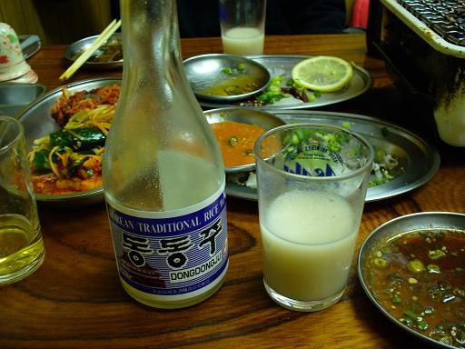 いつもは、安く上げるために壜ビールだけなのだが、今回は韓国の동동주(ドンドンジュ)も高いが飲んだ。しかしこの酒辛い物に非常に良く合い、ホルモンはもちろんキムチの盛り合わせとの相性も抜群だ〜!