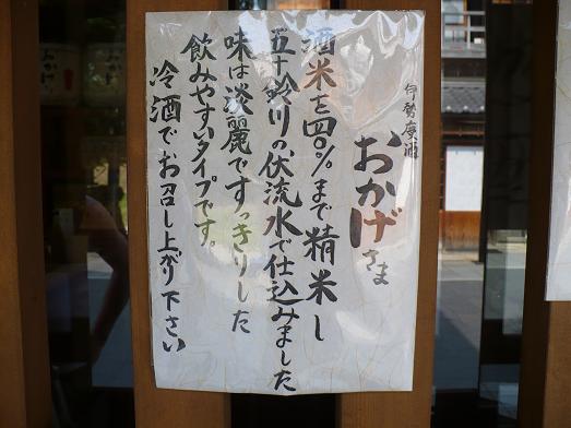 「今日の晩酌! VOL.442」今日は鳥羽の離島・答志島に行った帰りに立ち寄った伊勢神宮のおかげ横丁にある蔵元・伊勢萬で買った酒「伊勢慶酒・おかげさま」を冷酒で飲んだ!この酒、4合壜で1650円するのだがラベルには原料米や精米歩合の明記は一切なく一見、普通酒に見えるのだが