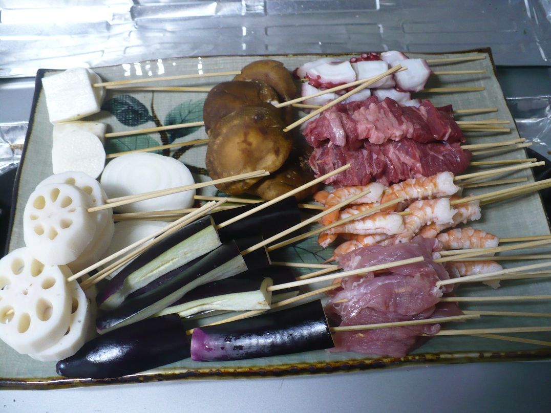 GWに実家に帰省した時に大阪の新世界で食べた串かつが、メチャ美味しかったので家庭で作って食べます!具材は牛肉・豚肉・タコ・海老・茄子・レンコン・椎茸・山芋・タマネギです。