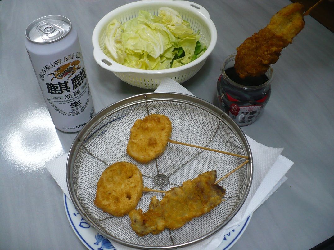 揚げたて熱々の串かつはメッチャ美味い!甘酸っぱいソースが良く合います!発泡酒やけど・・・ ビールが進みます!何本でも飲めそう^^ 店で食べる串かつも美味しいけど、家のも美味しいです!手間ですが店よりかなり安く上がるので金欠の時はお薦めですよっ!^^