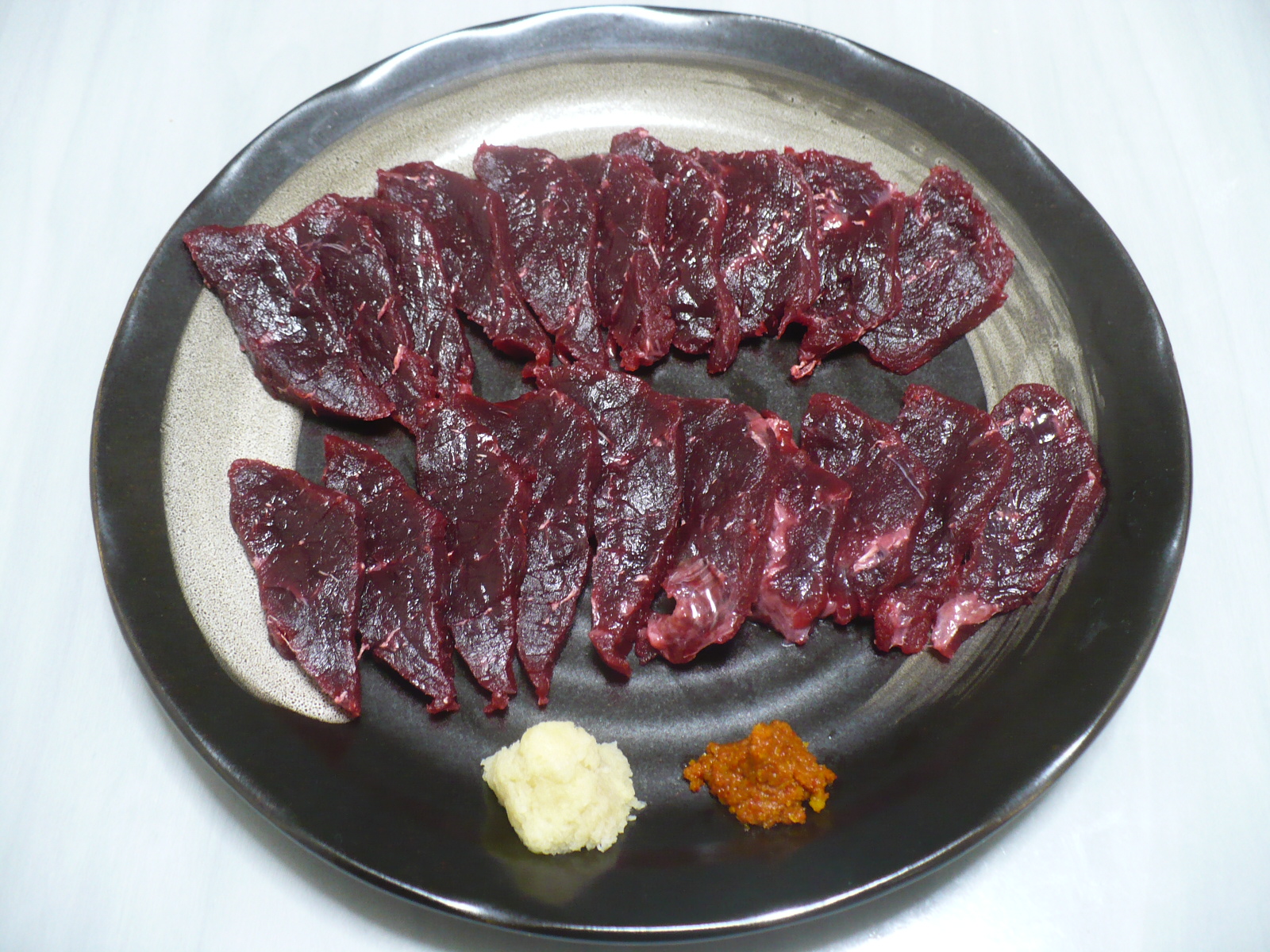 今日の酒の肴はニタリクジラの造りで〜す。 あまり脂っ気のない赤身の部分なのでサッパリとしていて、生姜や柚子一味に醤油を付けて食べると美味しいです。