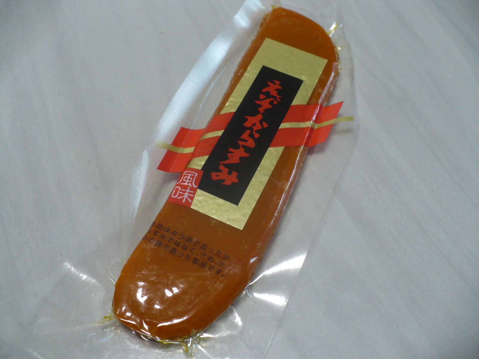 今日の酒の肴は北海道で買った「えぞからすみ」を食べました。えぞからすみはボラの卵で作った本物の「からすみ」とは別物で鱈の卵と鮫の卵を卵黄を使って形成した模造品です。味は卵黄の味味と塩分が強く、噛めば粘性があり歯にくっついて食べ難いですが、でもまぁまぁ美味しかったです