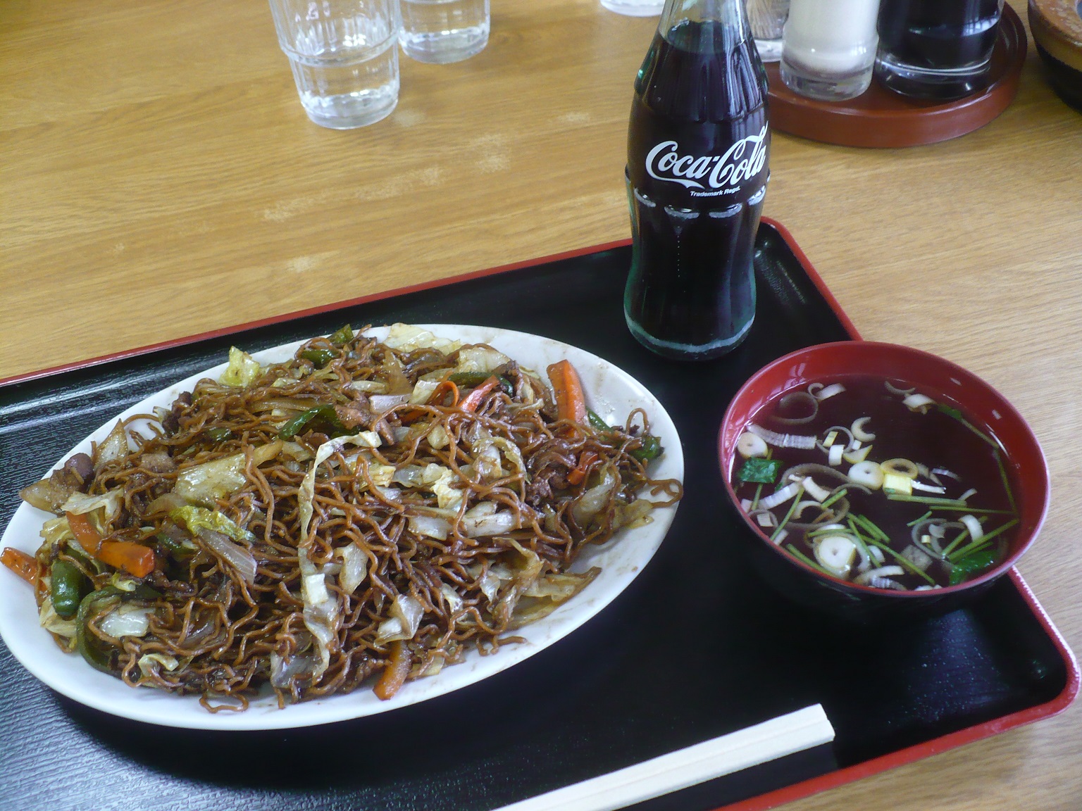 今日は「野菜やきそば」(650円)を注文しました。今日は日曜日という事もあり13時過ぎに店に行きましたが満席でした。でも合席させてもらったので待たずに座れました。そして最近テレビに紹介されたせいか・・・・?オムライスを注文する客ばかりでした。そして野菜やきそばを食べた感想は、極細のやや固めのちぢれた麺に歯応えがあって、また麺にソースが染みこんでて濃い味わいですが美味しいです。650円にしては結構な量があるので満足すると思います。焼きそばに良く合う壜コーラは150円です。^^