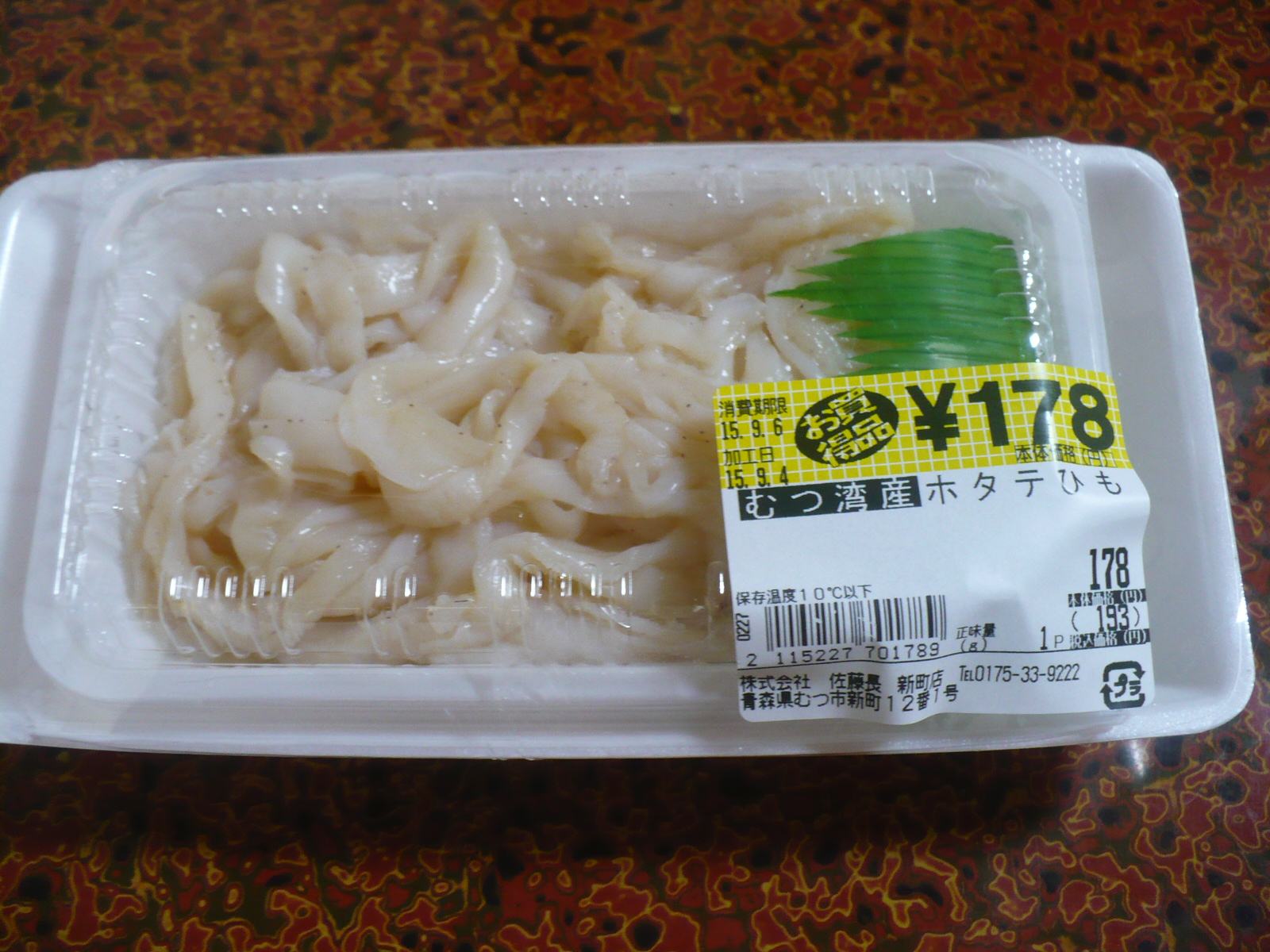 酒の肴は陸奥の地酒に陸奥の肴です! 地元産のホタテのヒモの刺身です!1パックに結構な量が入って178円と激安!そして美味い! コリコリとした食感がたまりません!(^∀^)