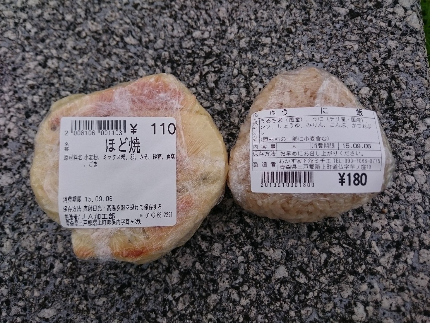 2日目 八戸市内の道の駅で買った、ウニ飯のおにぎりとほど焼