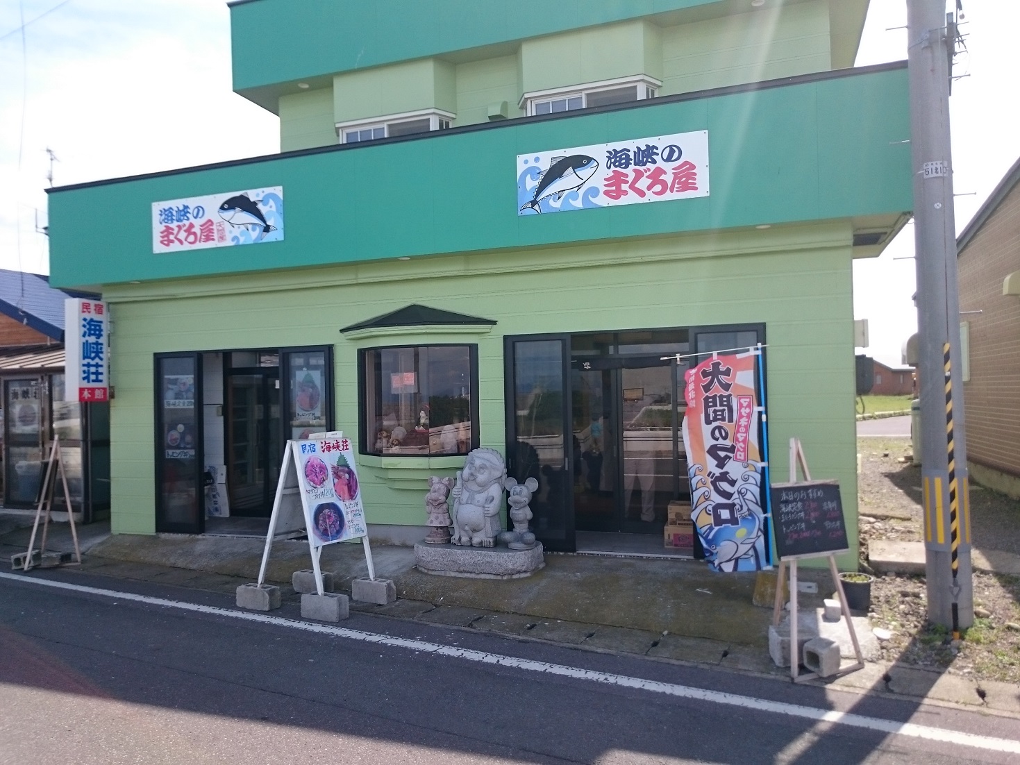 大間での目的は9月から獲れ始める大間産の生マグロを食べる為で、今回の旅の一番の目的でもあります。そして新鮮な生の大間産のマグロが食べれる事で定評がある「民宿・海峡荘」に行きました。海峡荘さんは民宿ですが、新鮮な海鮮料理を食べさせる飲食店でもあります。