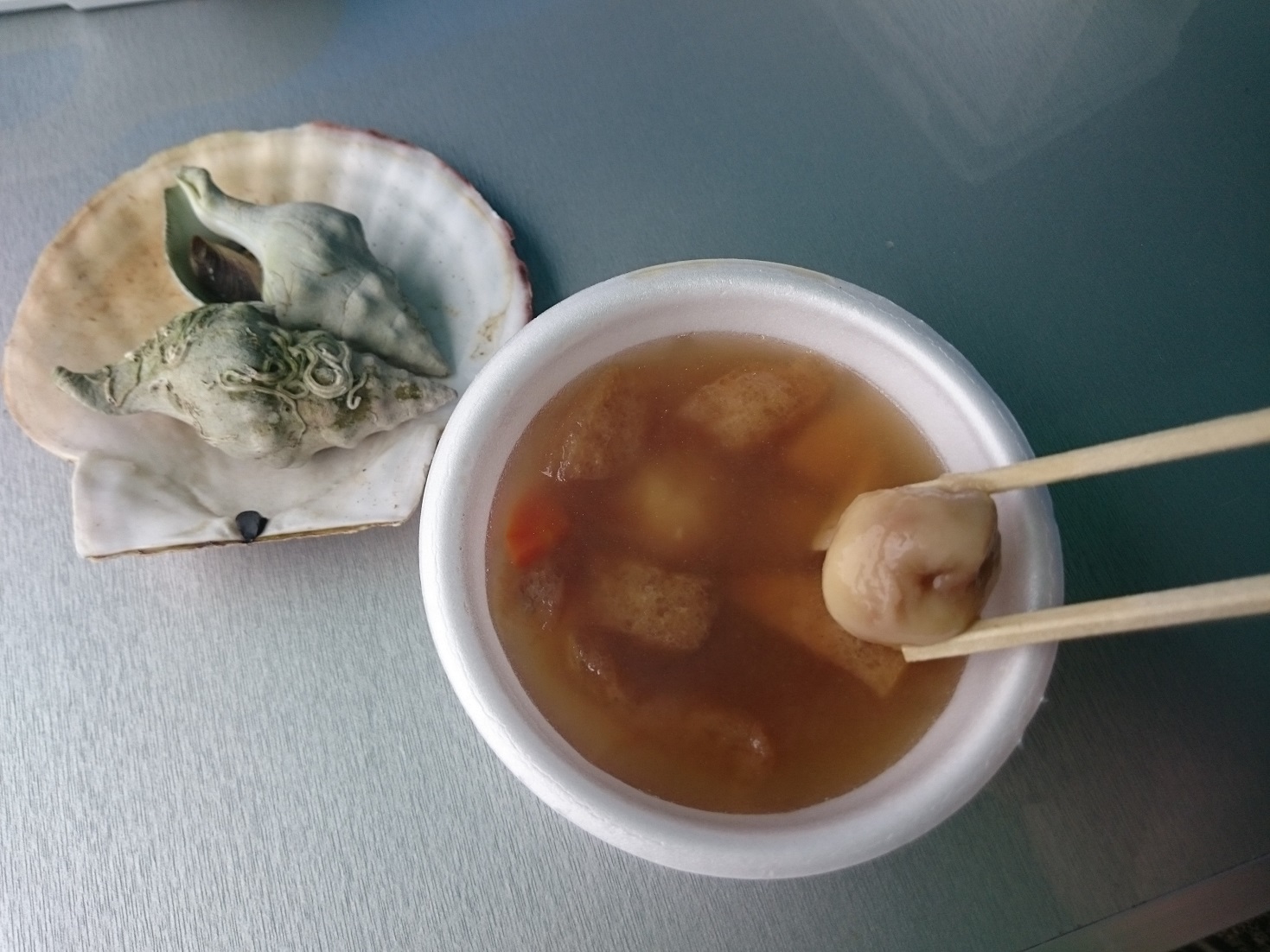 まめぶ汁、1杯300円だったので食べてみました。汁だけ飲むと具沢山の醤油味の汁物だが、丸い団子みたいのを食べると甘い!中にはクルミと黒糖が入ってました。汁は美味しいけど「まめぶ」と呼ばれる甘い団子と汁の相性は微妙です。甘じょっぱくて・・・ でもこの地方伝統の郷土料理が食べれて嬉しかったです。そしてまめぶ汁の横にあるのが海女さん曰く「沖つぶ」と呼ばれる貝らしく焼いた物が2個で200円でした。身は少し硬めでしたが旨みがあって美味しかったです。日本酒と一緒に食べれば最高であろう・・・・