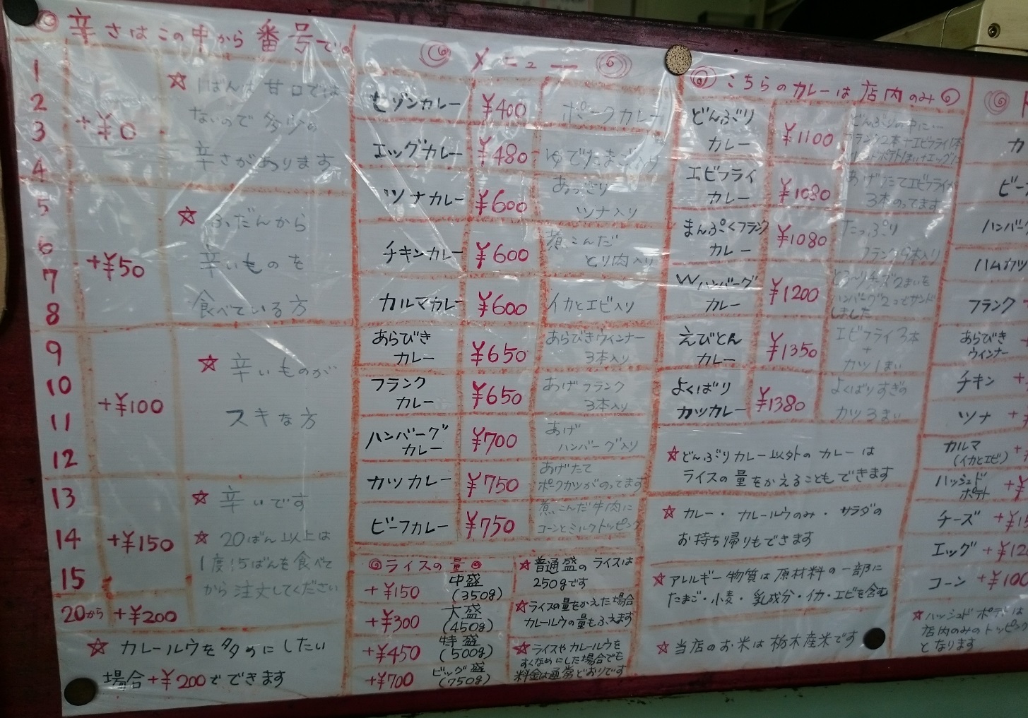 セゾンのメニューです。ノーマルのセゾンカレーは400円と結構安いです。辛さは1〜20の20段階から選べて辛さに応じて別途料金がかかります。15を食べた人に限り20以上の超激辛を特別注文できます。