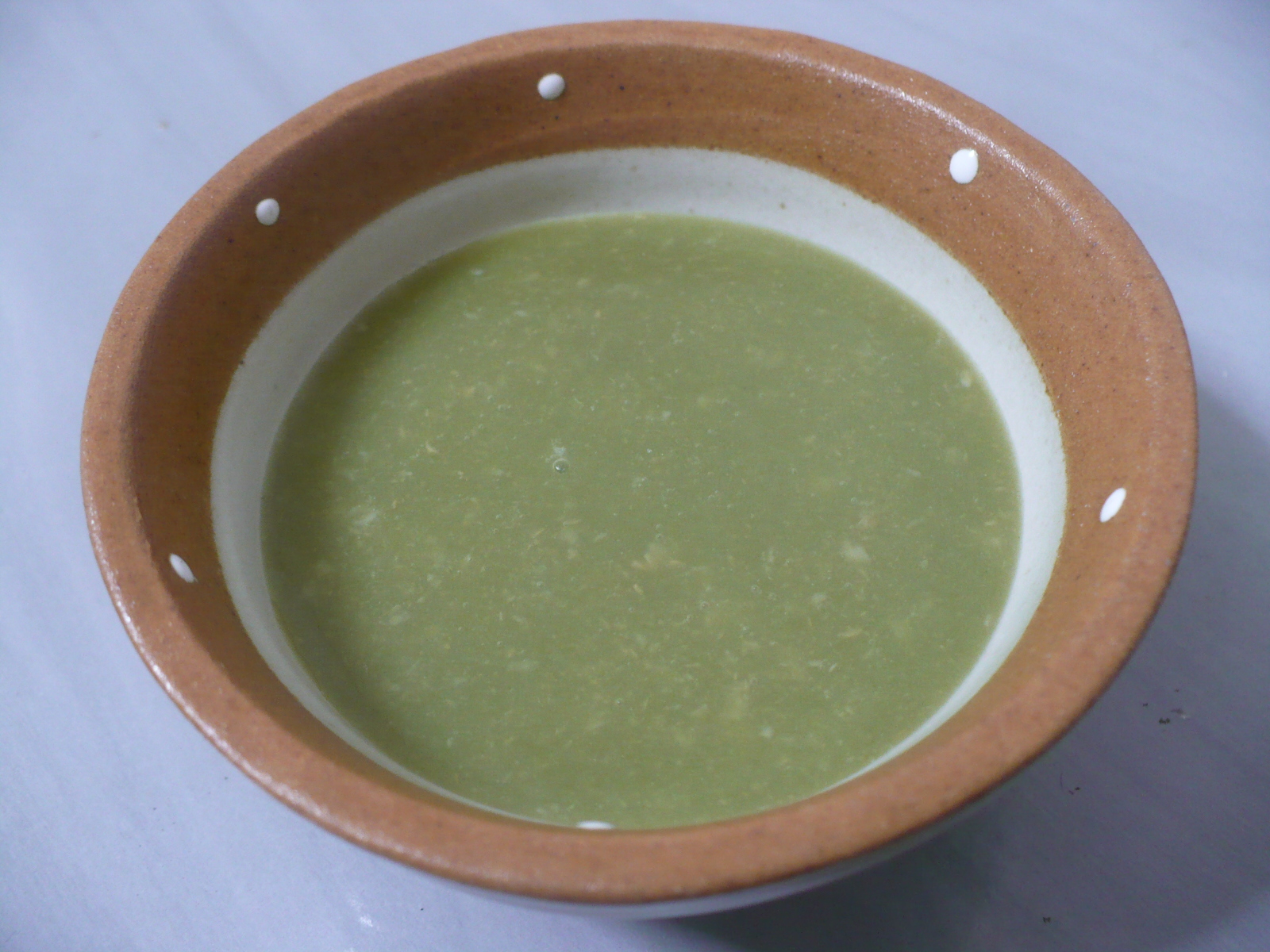 器に注いで見るとこんな感じで、一見 ほうれん草のスープの様にも見えますね。飲んだ感想は甘みが強めの甘酒で、抹茶の良い香りします。後味は抹茶の渋みと苦味が口の中に残りますが、ちょっと変わった甘酒の味わいで結構美味しかったです。