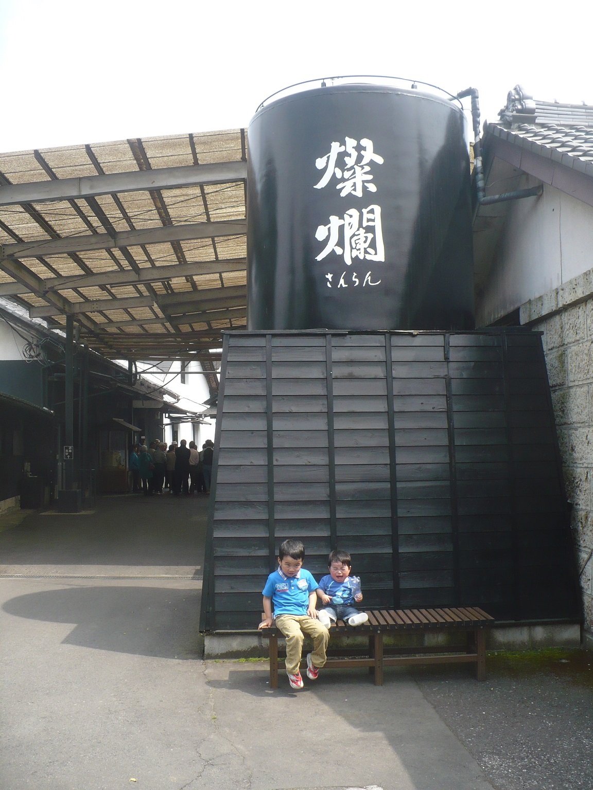 酒蔵で記念撮影〜(^∀^)v でもベンチが高くてこわ〜い(泣)