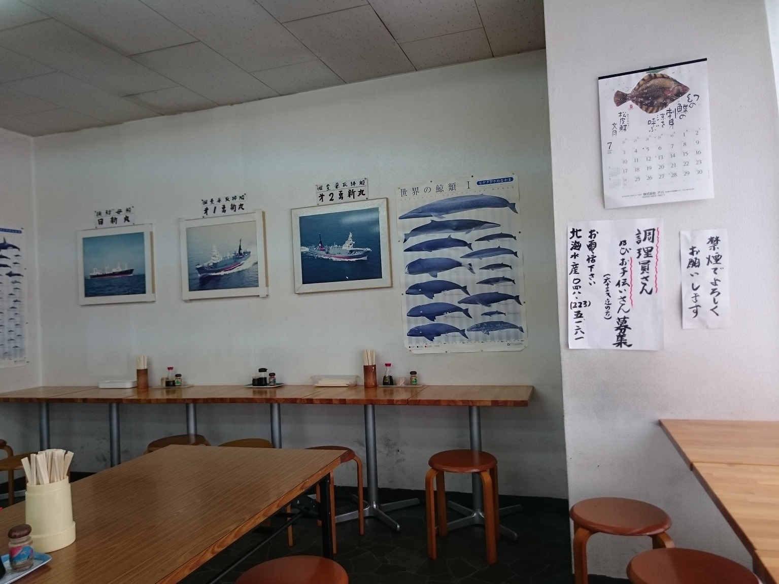 店内には鯨のポスターや調査捕鯨の捕鯨船の写真などが飾られていました。貼紙には「調理師さんとお手伝いさん募集」となっています! 人気があるんでしょうね。(^∀^)
