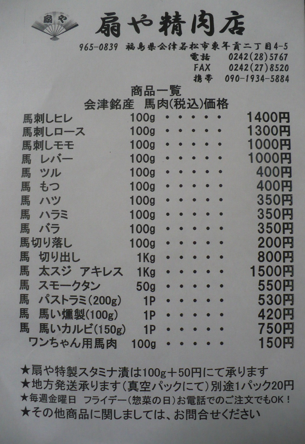扇や精肉店の馬肉のメニュー表です。馬刺しから加熱用の馬肉、そして犬用の馬肉まで販売されています。
