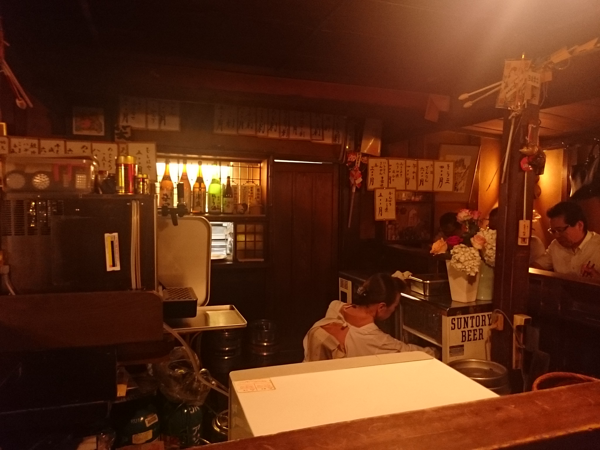 店内は薄暗くて雰囲気があり、こじんまりとコの字形のカウンターがあるだけで、真ん中には着物姿の女将さんがいます。