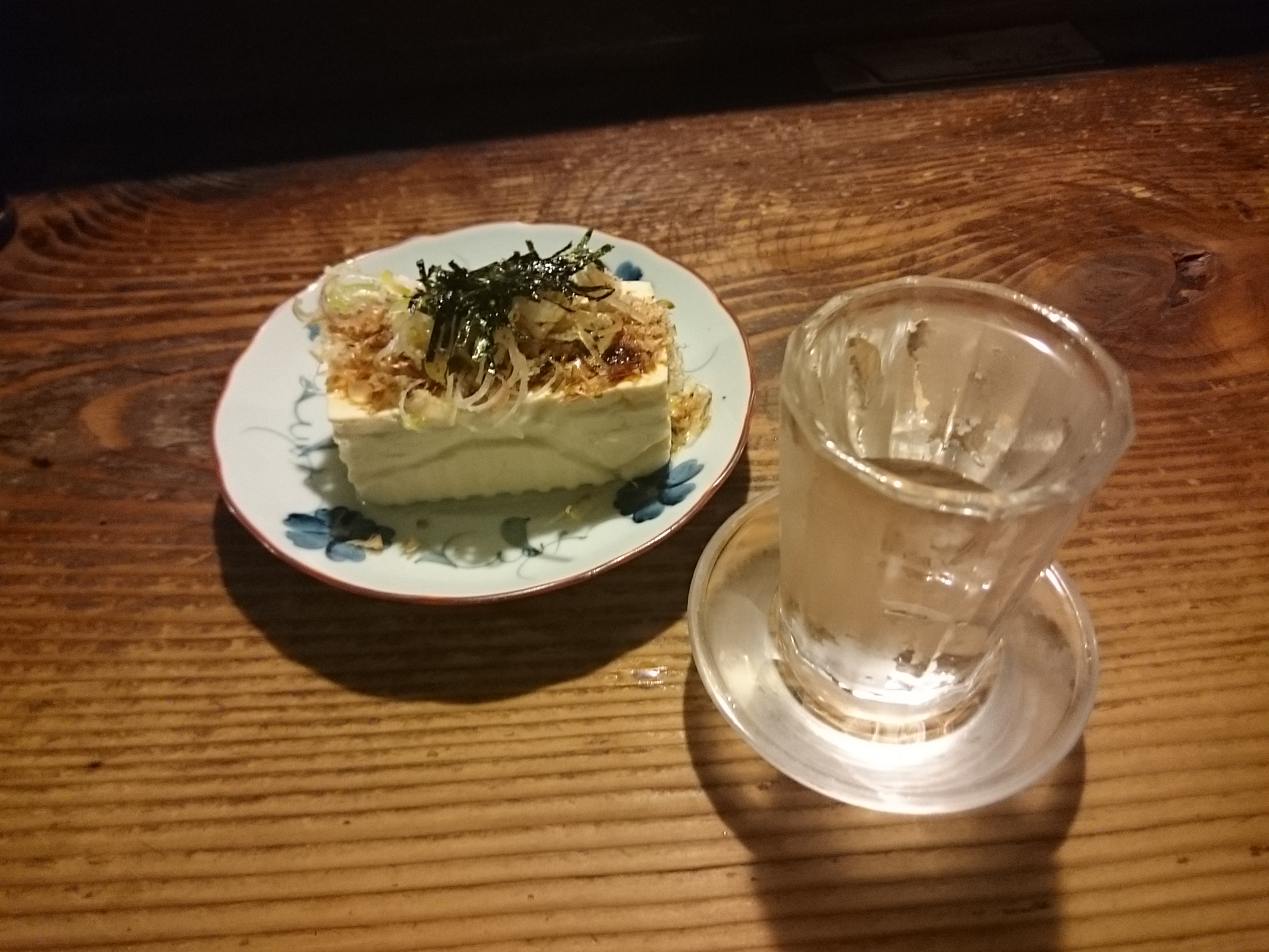 2杯目は秋田の高清水・辛口(900円)を注文 お通しには冷奴が出てきました。