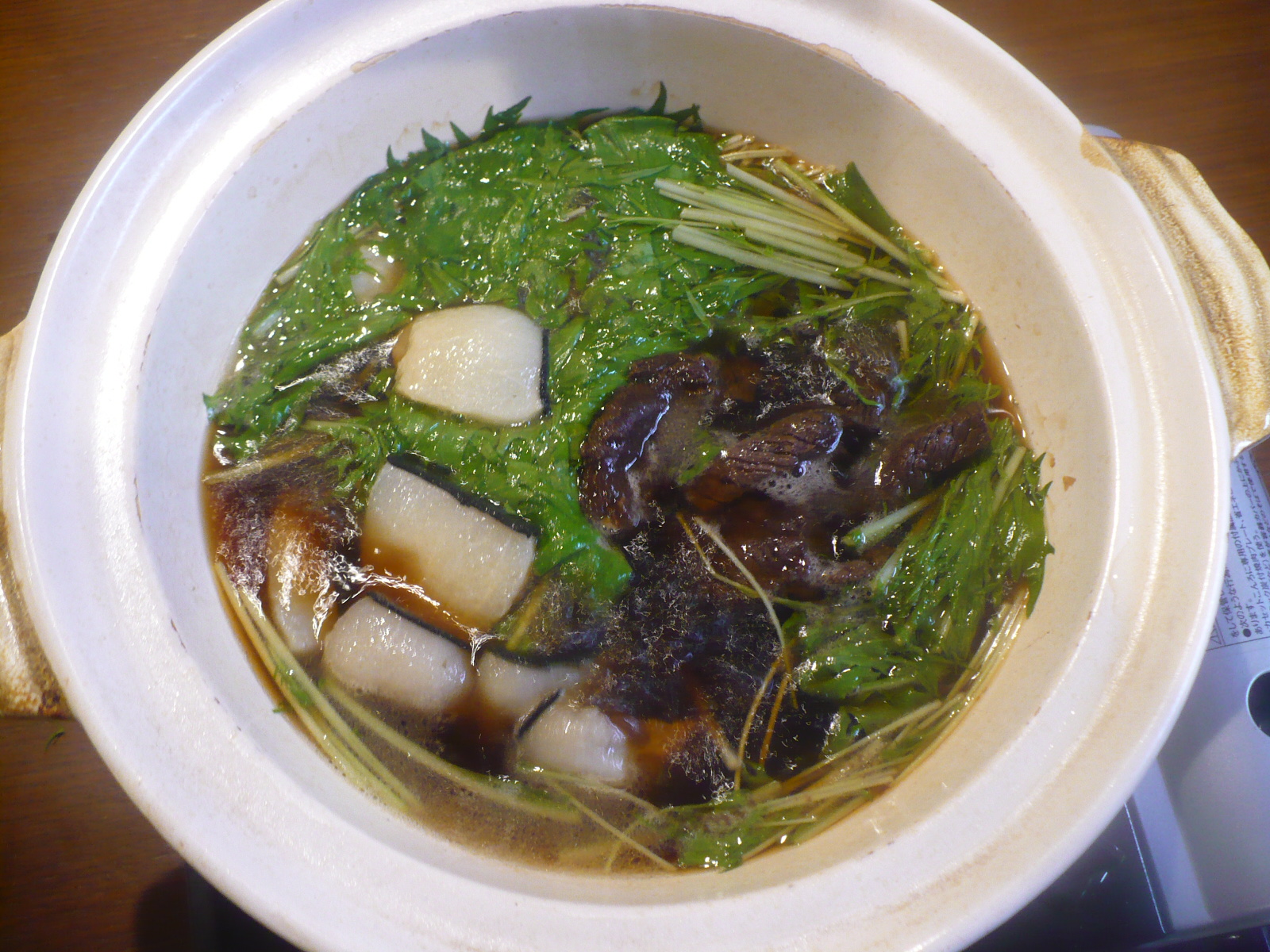 醤油・味醂・日本酒・砂糖に水菜と鯨肉を入れて煮込みます。