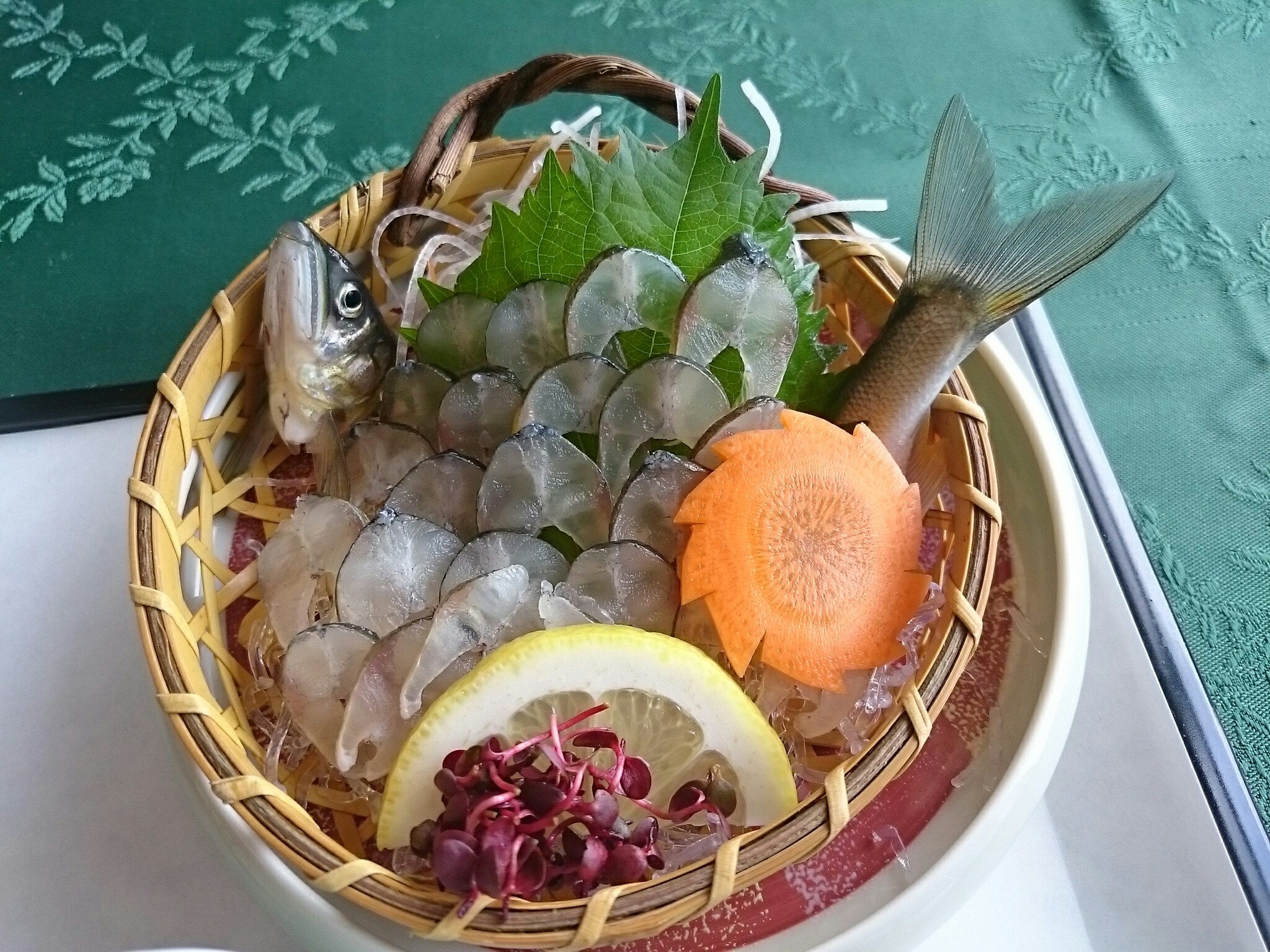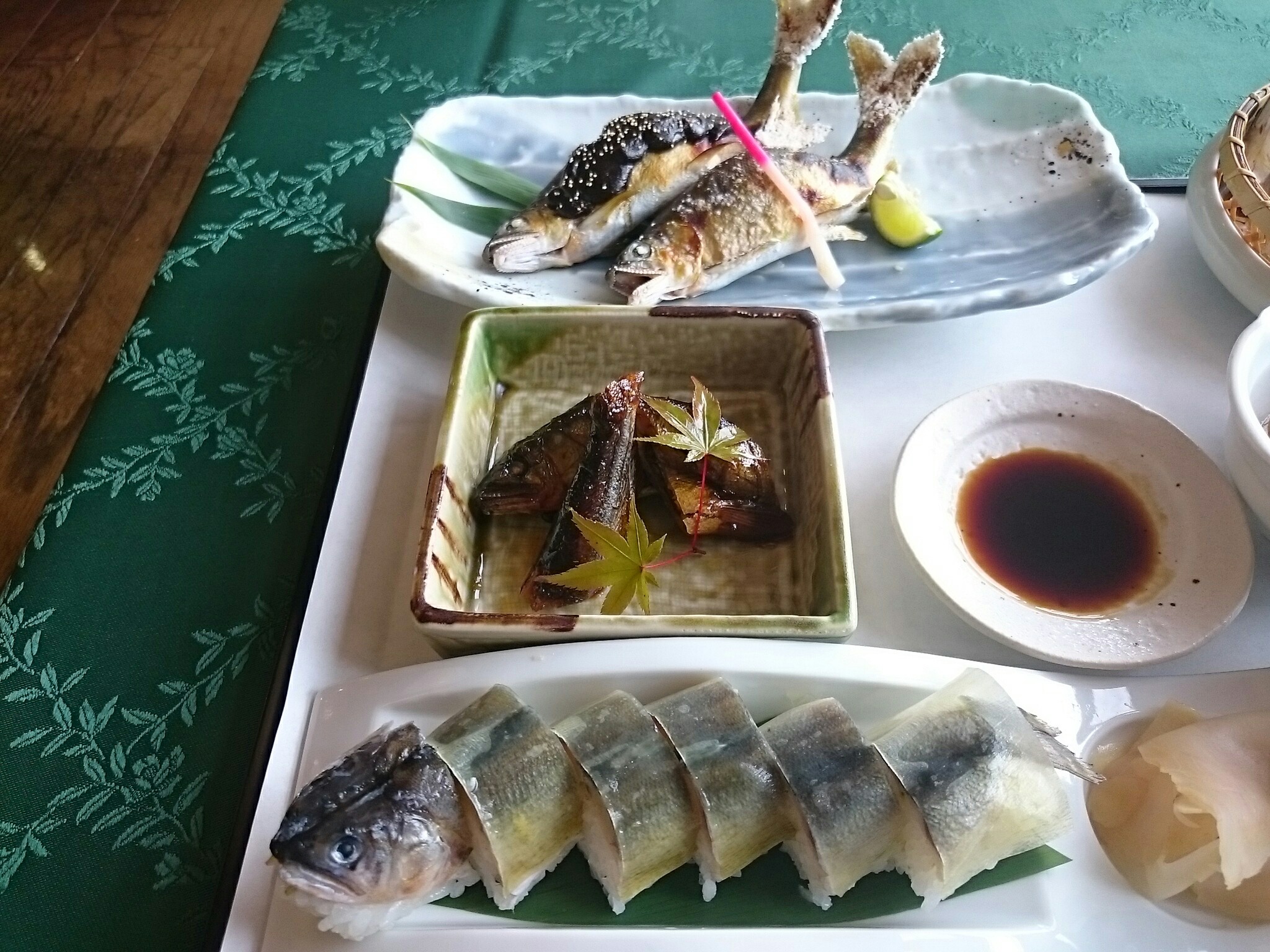 出てきました!注文したのは、鮎づくし(2570円) で若鮎の塩焼きと味噌焼き・若鮎の甘露煮・若鮎の背ごし・若鮎の姿寿司・若鮎のつみれ汁と若鮎料理が6品も付いてきます。