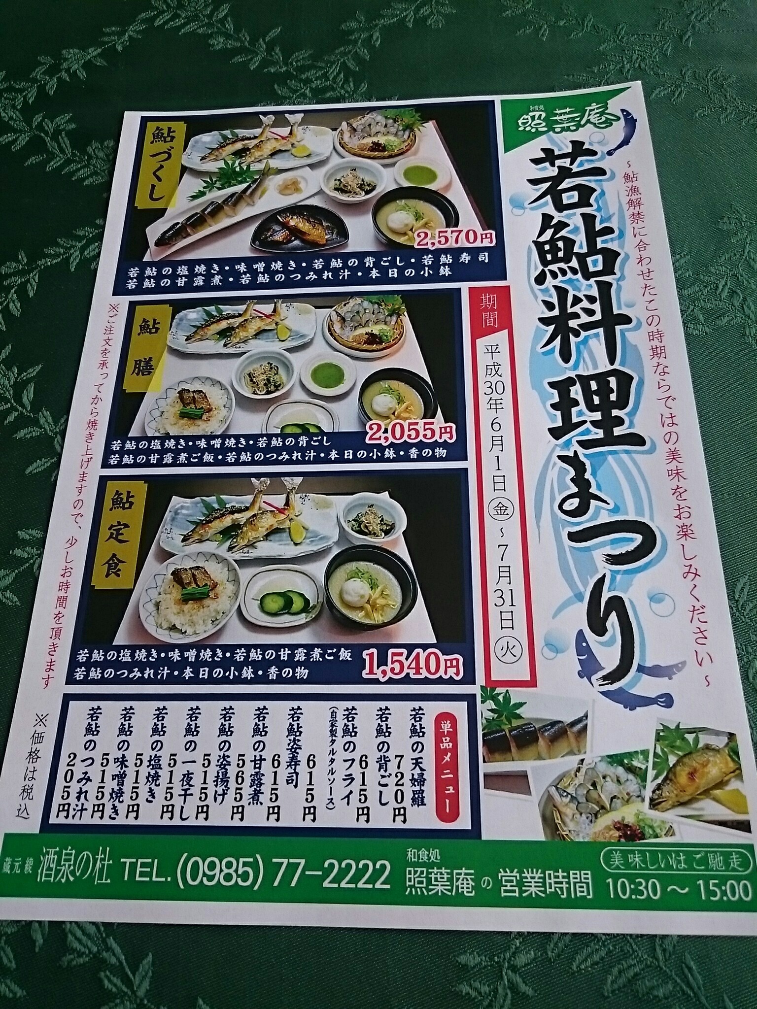 酒泉の杜の和食処・照葉庵では、今が旬の若鮎が期間限定で食べられる「若鮎料理まつり」をしていたので、鮎好きの私は素通りする事ができないので、食べる事に・・・