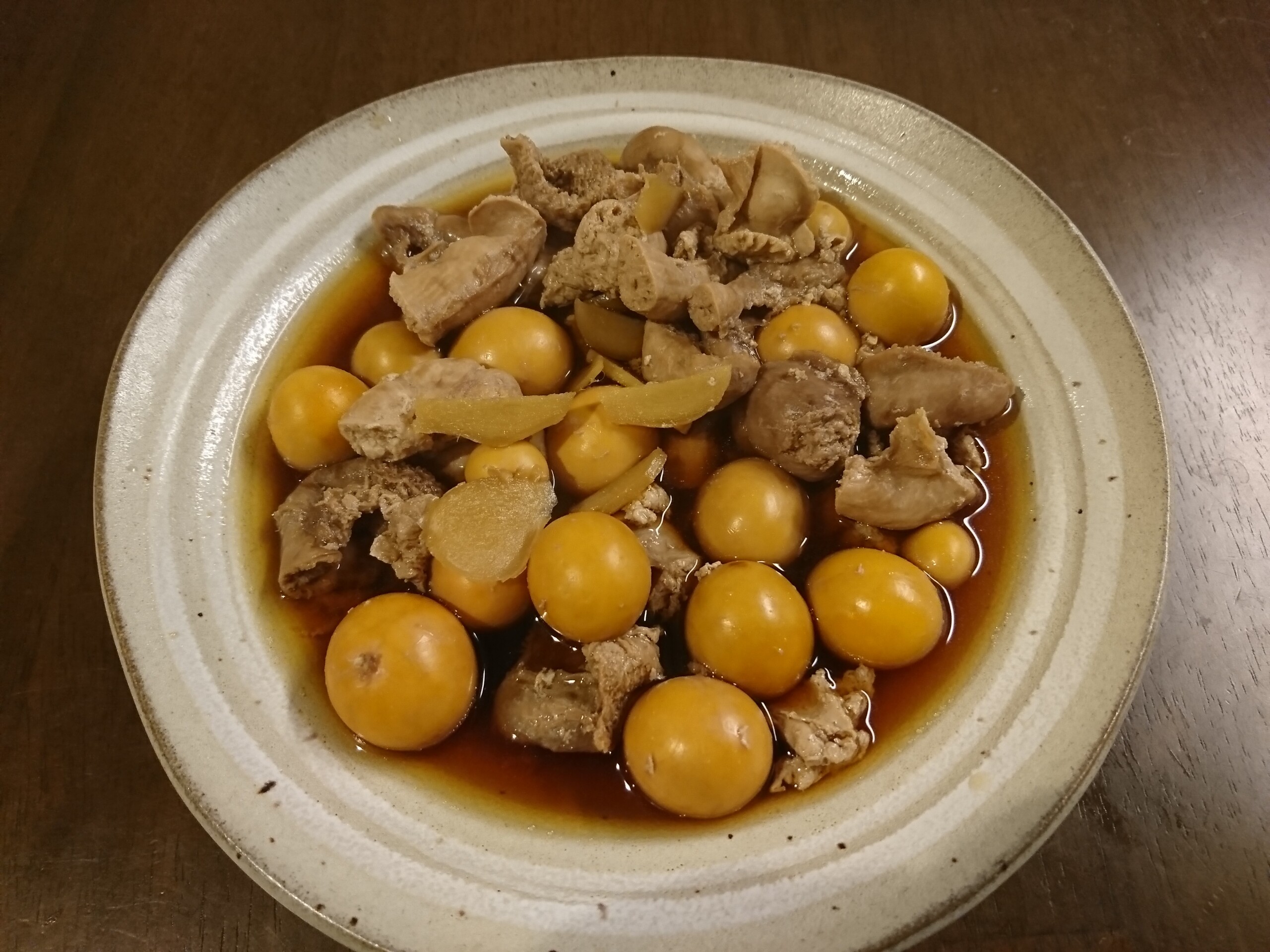 今日の酒の肴は鶏の玉ひもを買ったので、醤油・砂糖・味醂に生姜を入れて煮ました。