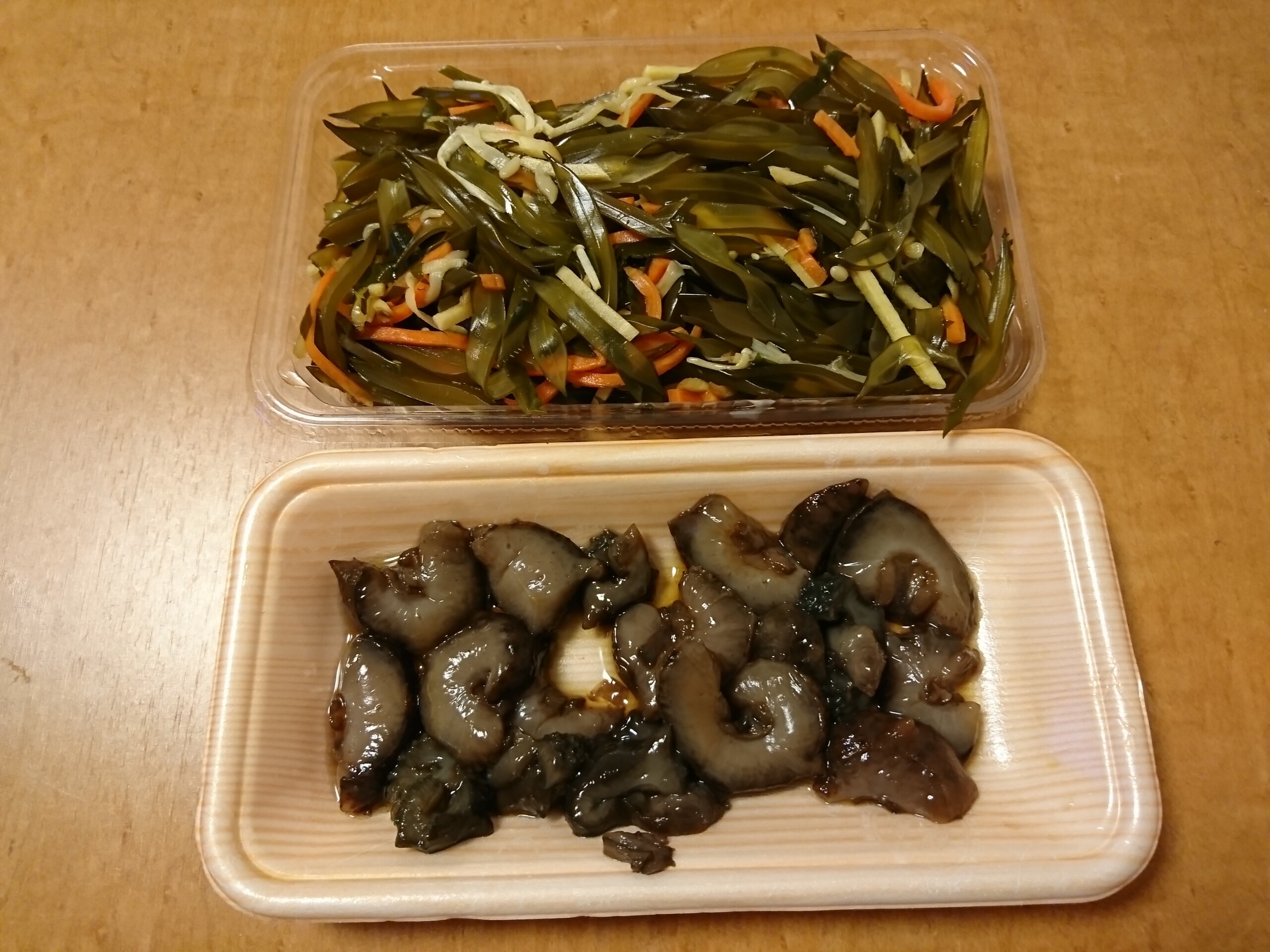 ナマコは何かコリコリじゃなくて、ブヨブヨとしていましたが、味付けも良くまぁまぁ美味しかったです。茎わかめの醤油漬は少し塩分が強く塩辛いですが、茎わかめの食感と生姜や人参のシャキシャキした食感が良くて美味しあったです。酒の肴にも合いますが、熱々ご飯にのせて食べたら最高でした。