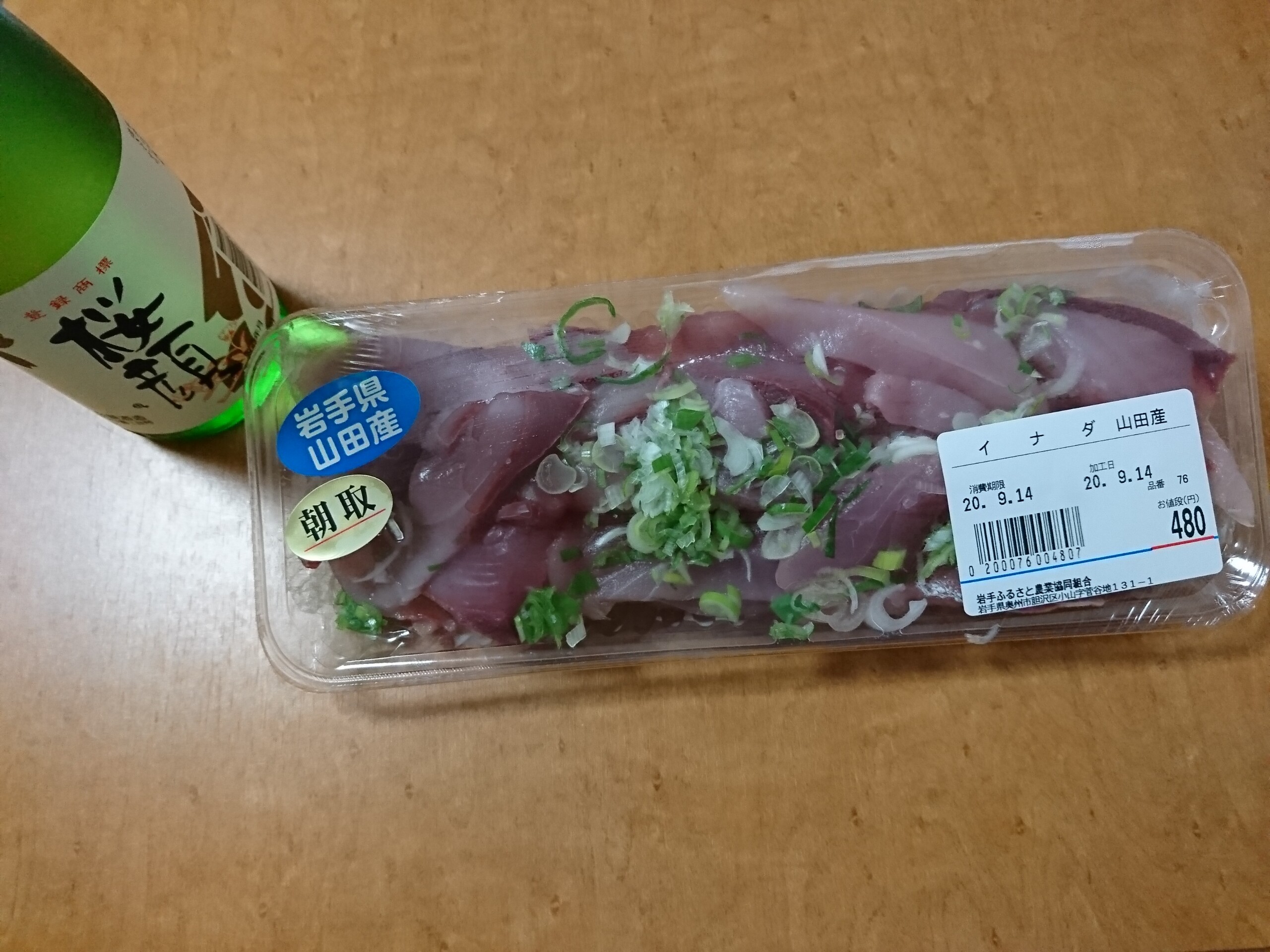 今日の酒の肴は奥州市内の産直で買った、岩手県山田町産の朝取りのイナダの刺身です。朝取りなので鮮度は抜群で臭味などは全く無く脂はのってませんがメチャ美味しかったです。