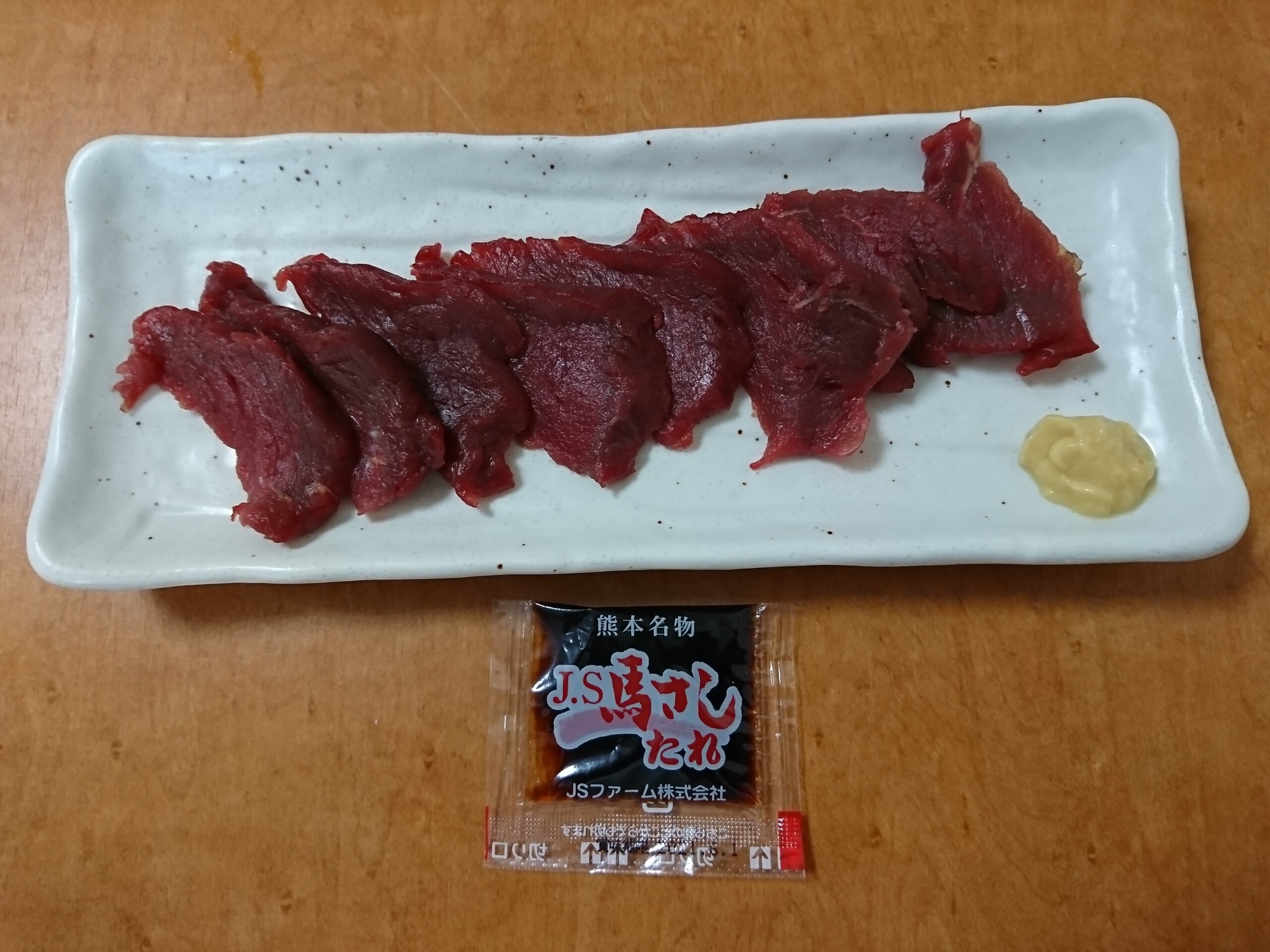 馬刺しは脂っ気の全くない、さっぱりとした赤身肉でちょっと淡白過ぎて物足りない感じもしますが、付属の甘い九州に醤油に生姜をのせて食べるとまぁまぁ美味しかったです。