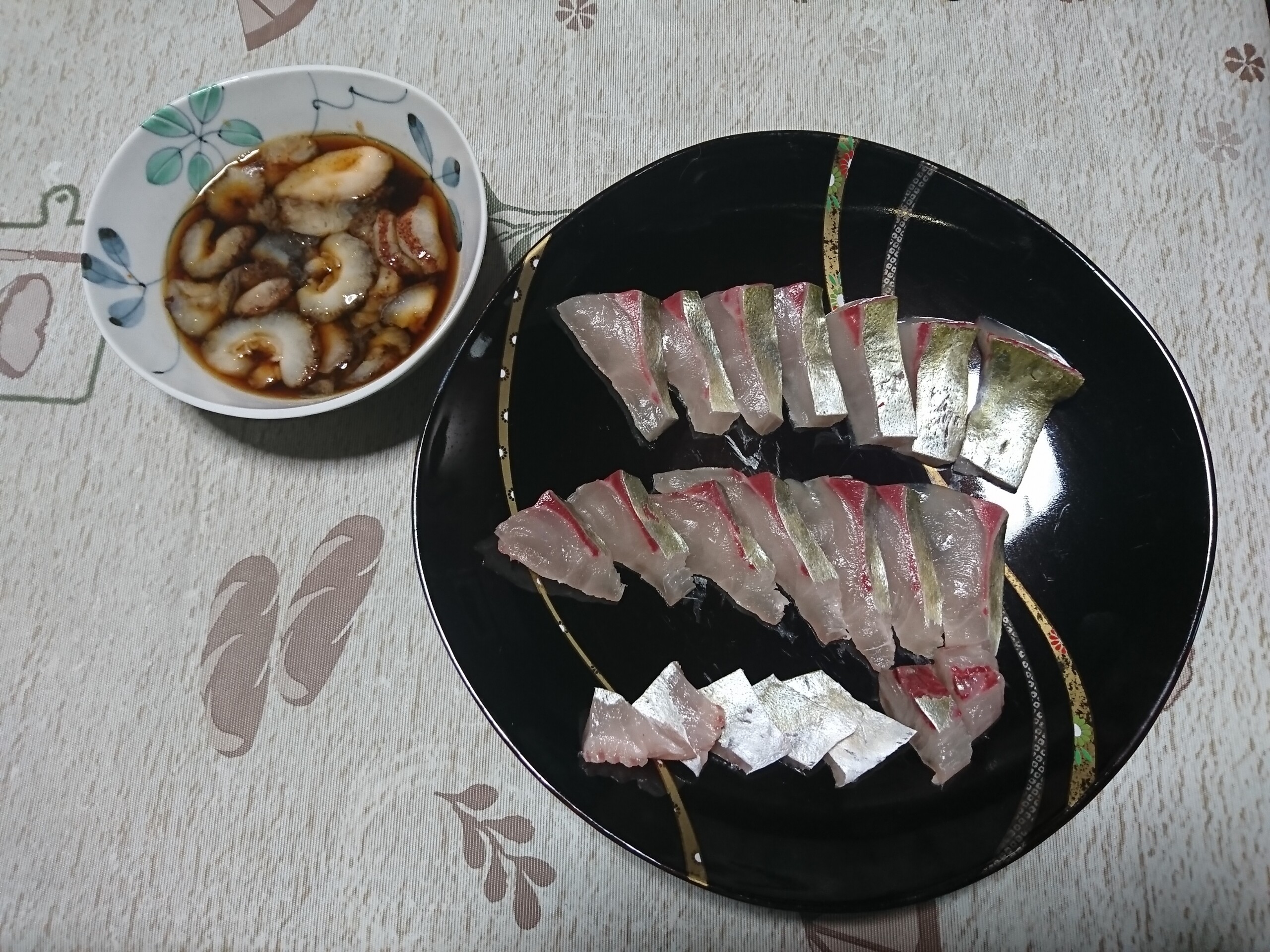 今日の酒の肴はスーパーで買ったシマアジの刺身と赤なまこです。シマアジは身がコリコリとしてて適度に脂がのってて旨味があって美味しかったです。赤なまこはもみじ卸しとすだち果汁とポン酢を混ぜ合わせて数時間漬け込んで食べました。こちらもなまこ独特のコリコリとした食感がありサッパリとしてとても美味しかったです。