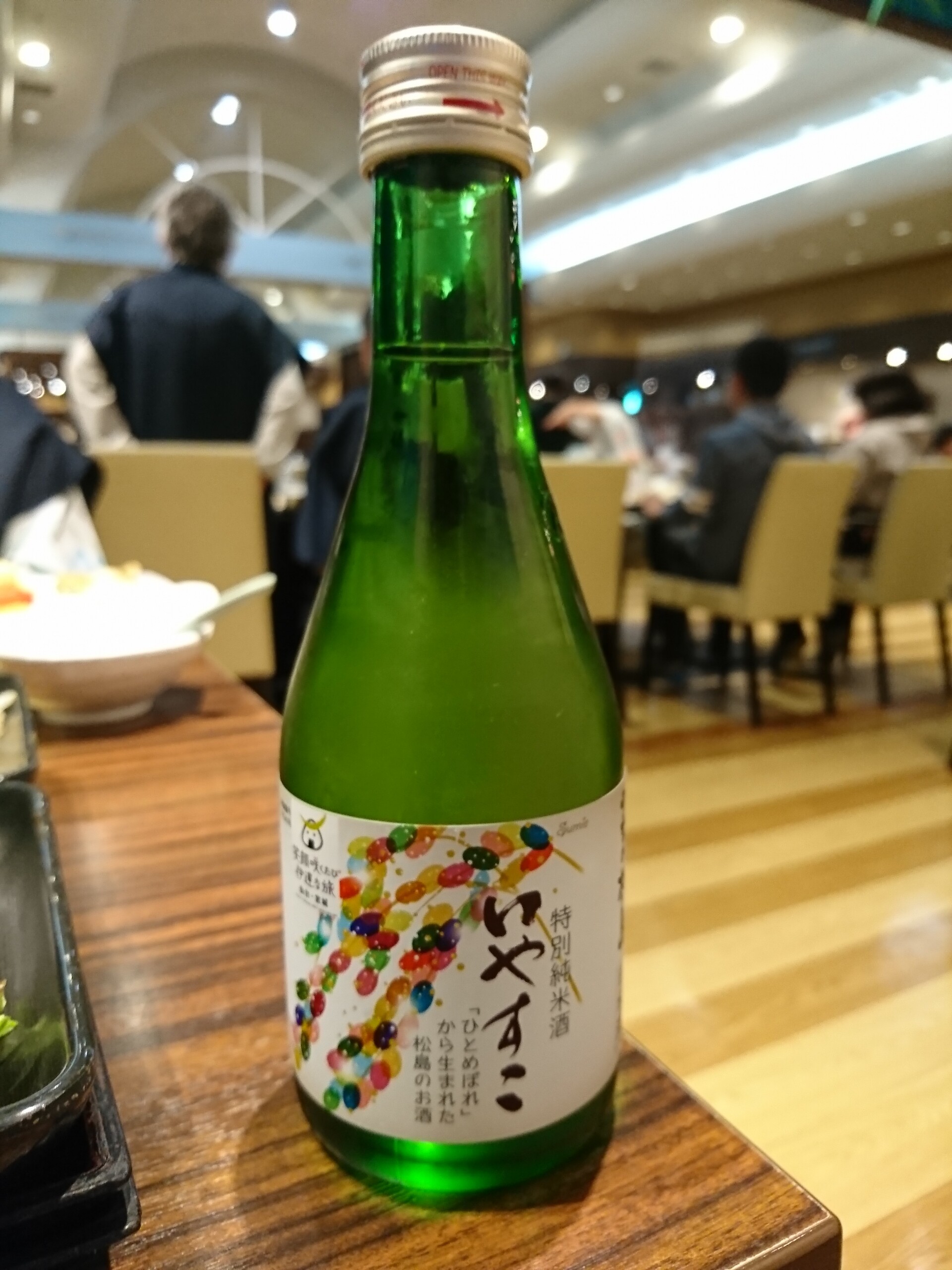 牡蠣鍋を食べながら、松島町限定出荷の松島町産のひとめぼれで仕込んだ特別純米酒「いやすこ」を飲みました。