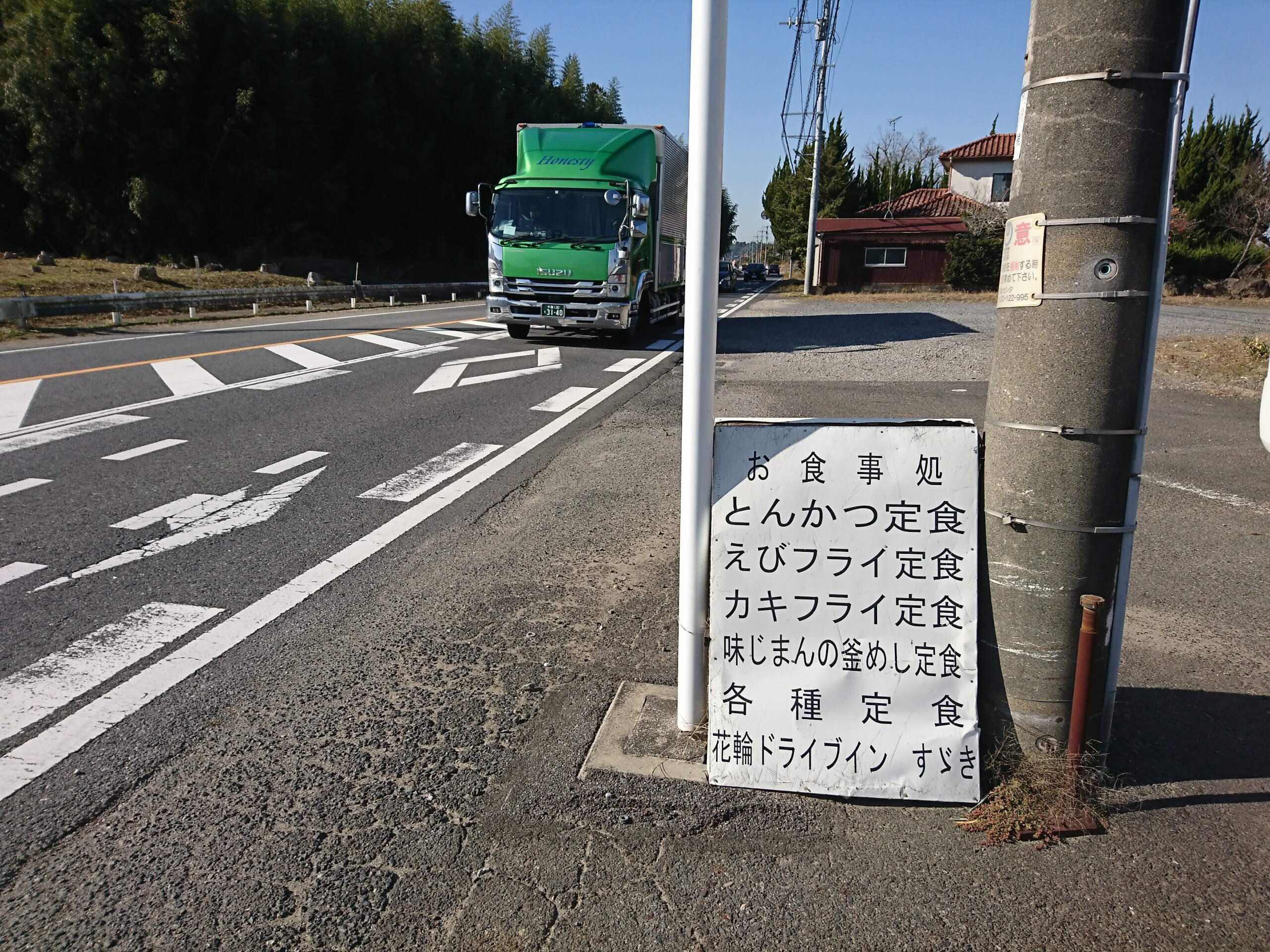 店の前には電柱と道路標識のポールの間にメニューの看板を挟めて風で倒れない様に固定されていました。^^