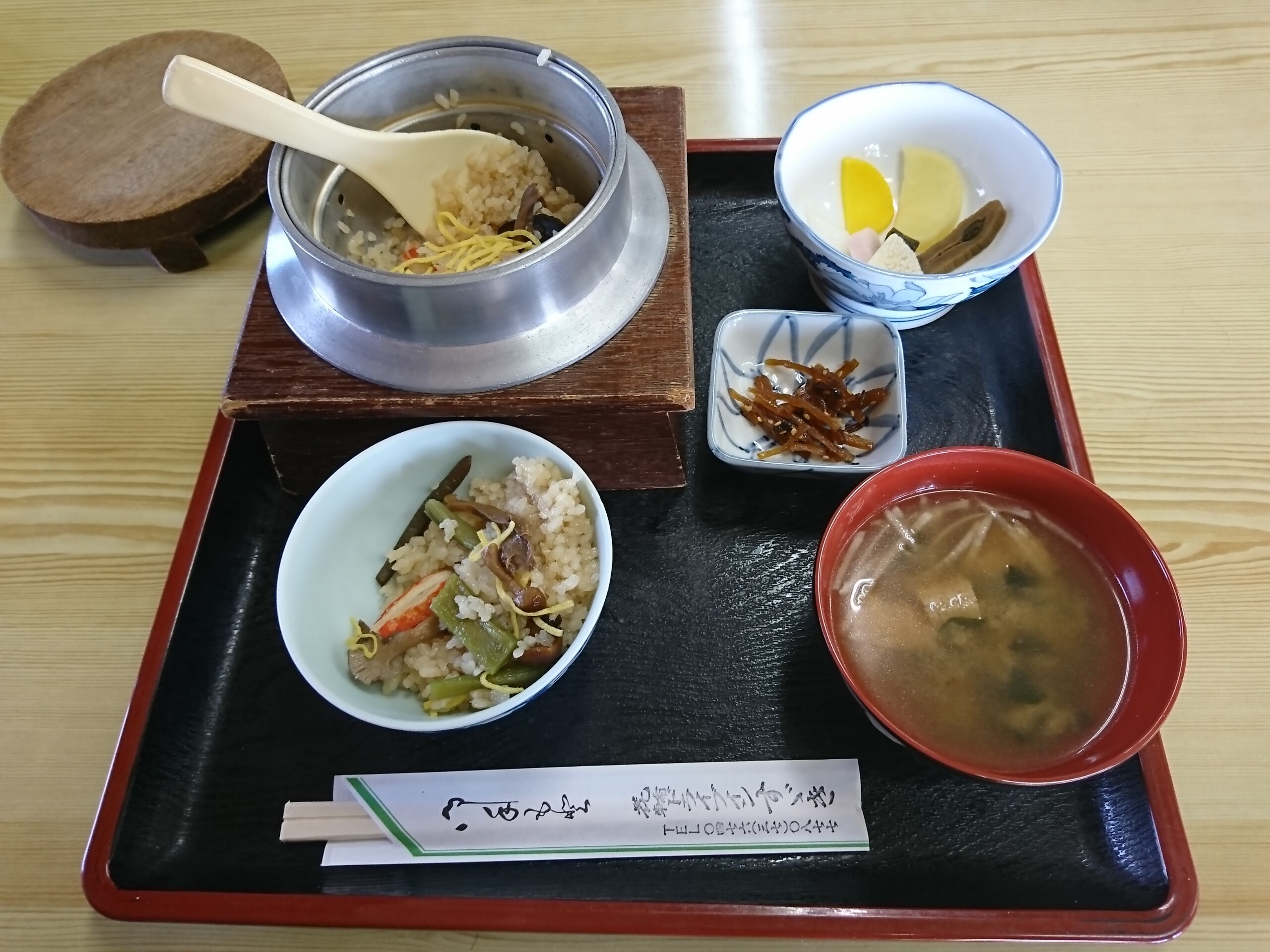 かに釜めし定食はかに釜めしに味噌汁・小鉢と漬物が付いています。