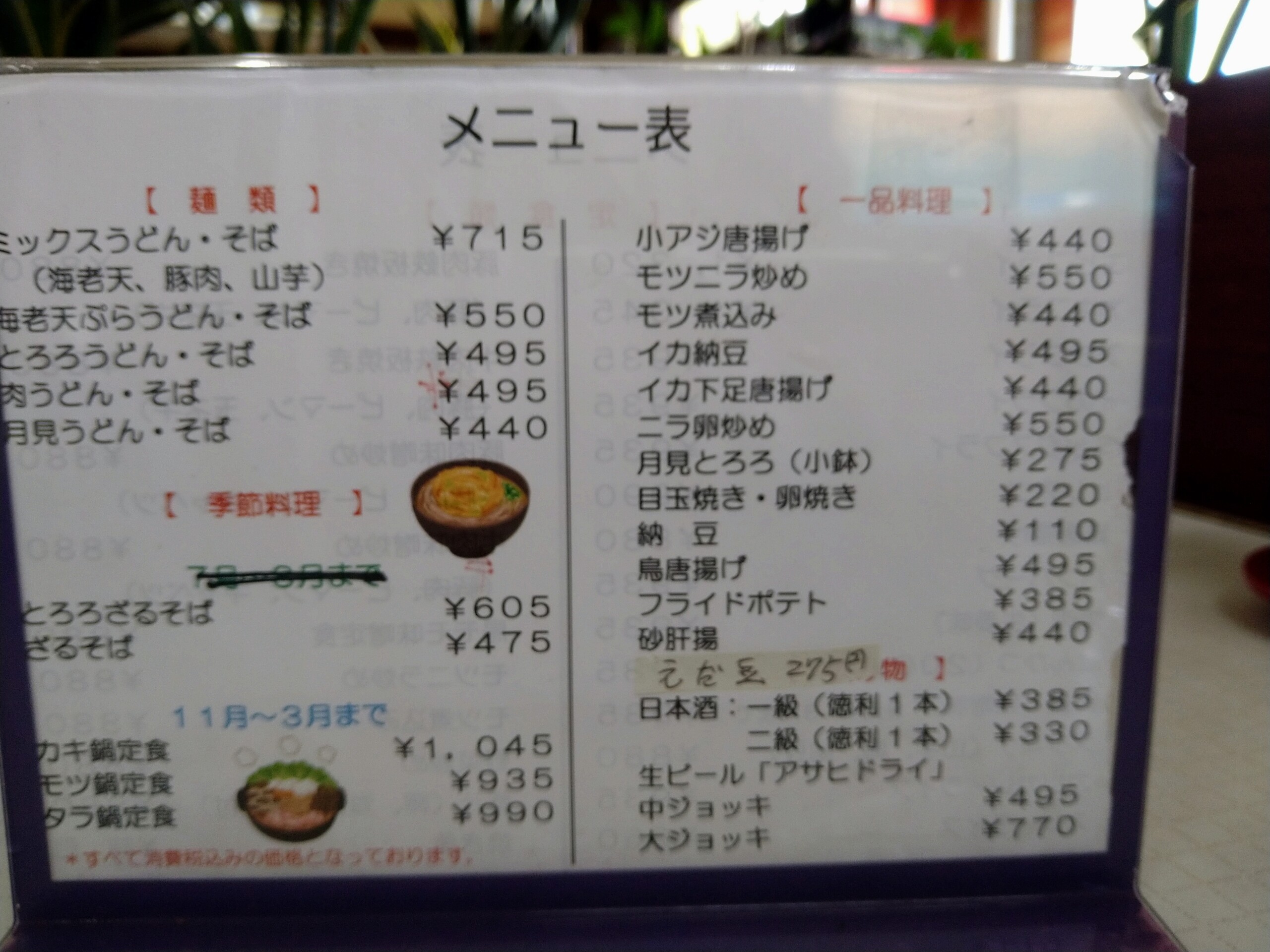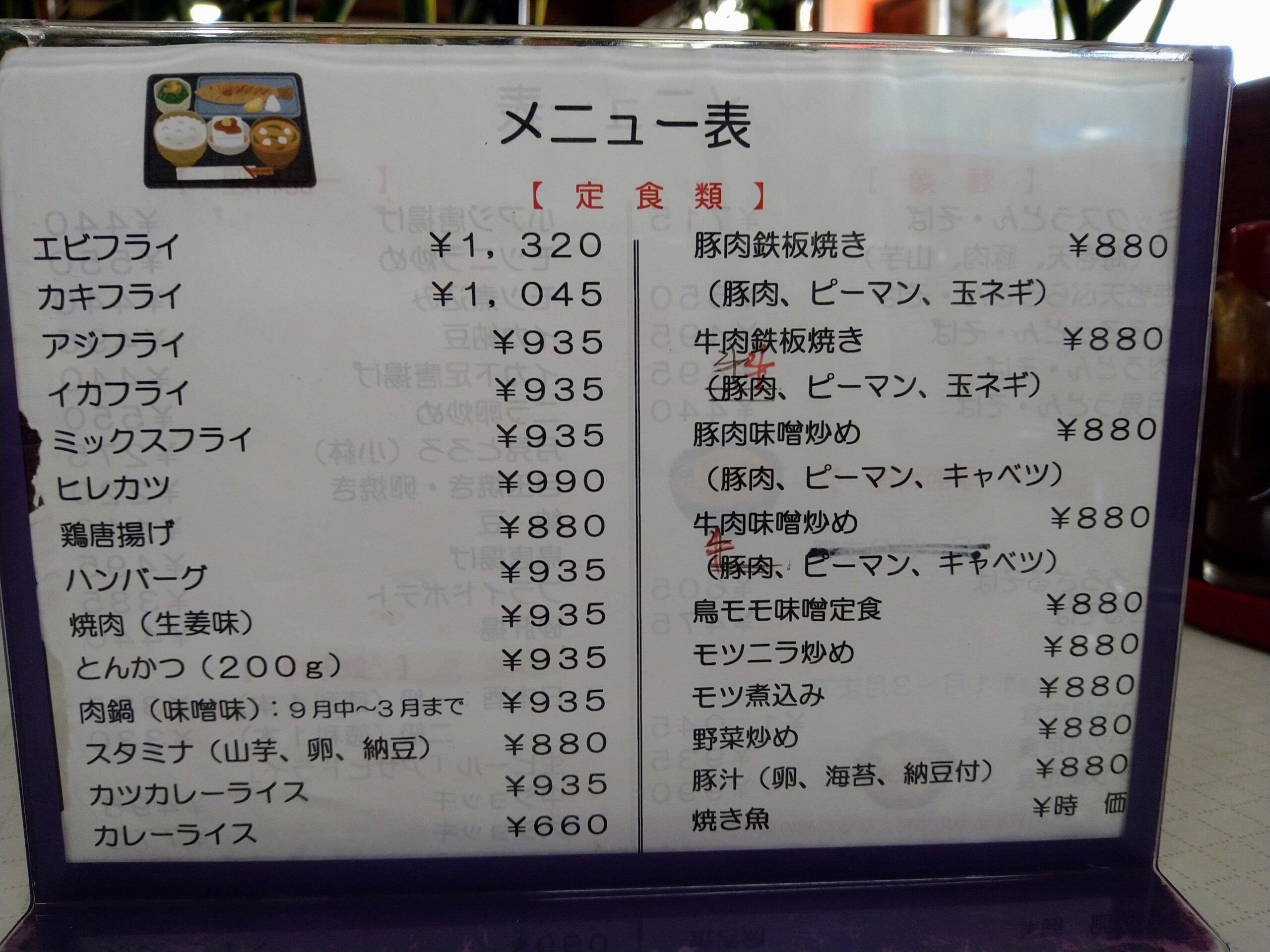 メニューです。充実した定食類 焼き魚定食の時価が印象的です。