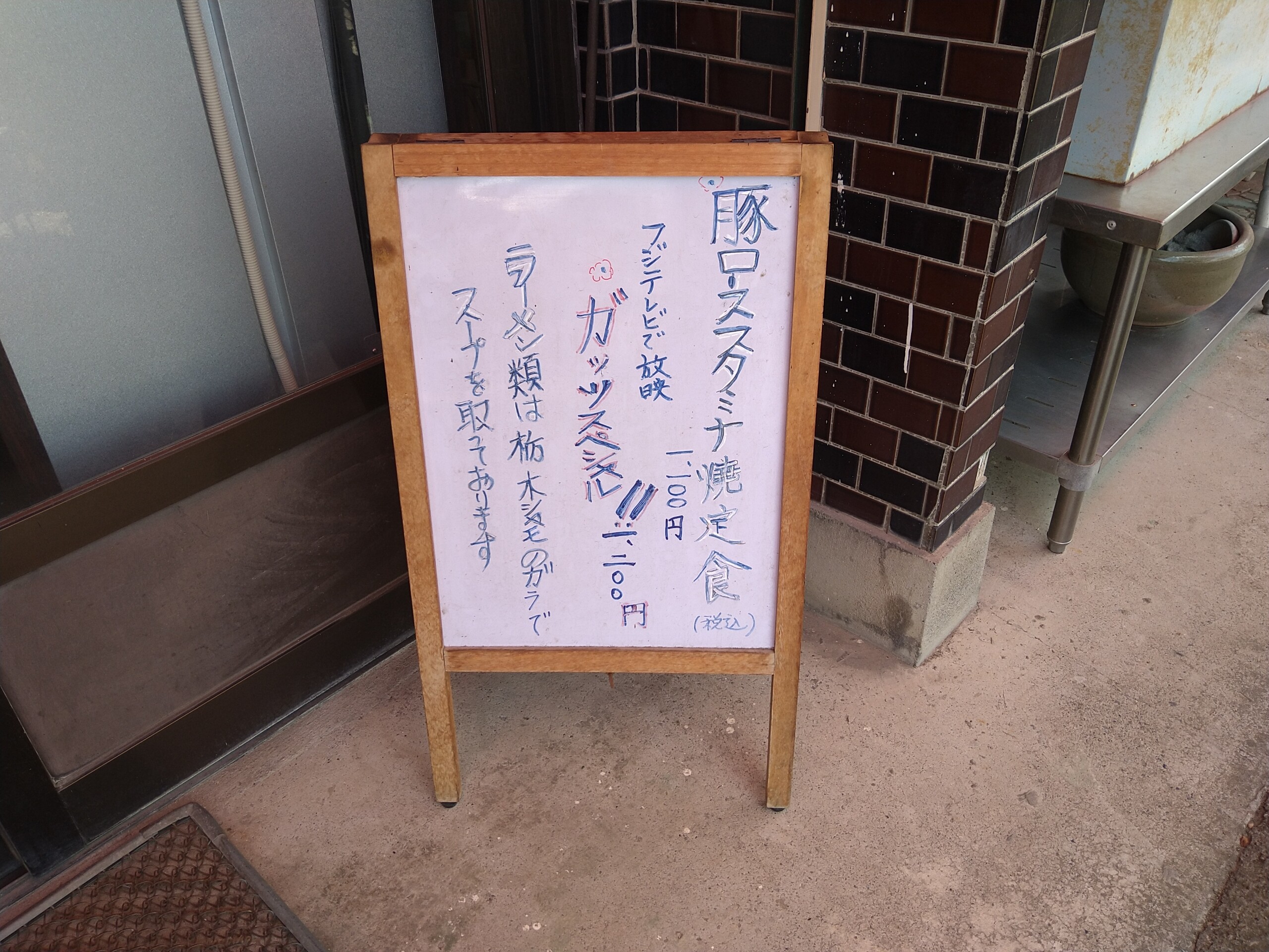 お店のメニューです。種類は少なめですが、ラーメン・カレー・カツ丼・定食各種があります。そしてテレビでも紹介された人気メニューが、ガッツ石松さんが大好物な豚ローススタミナ焼きに、ご飯大盛の定食「ガッツスペシャル定食」です。