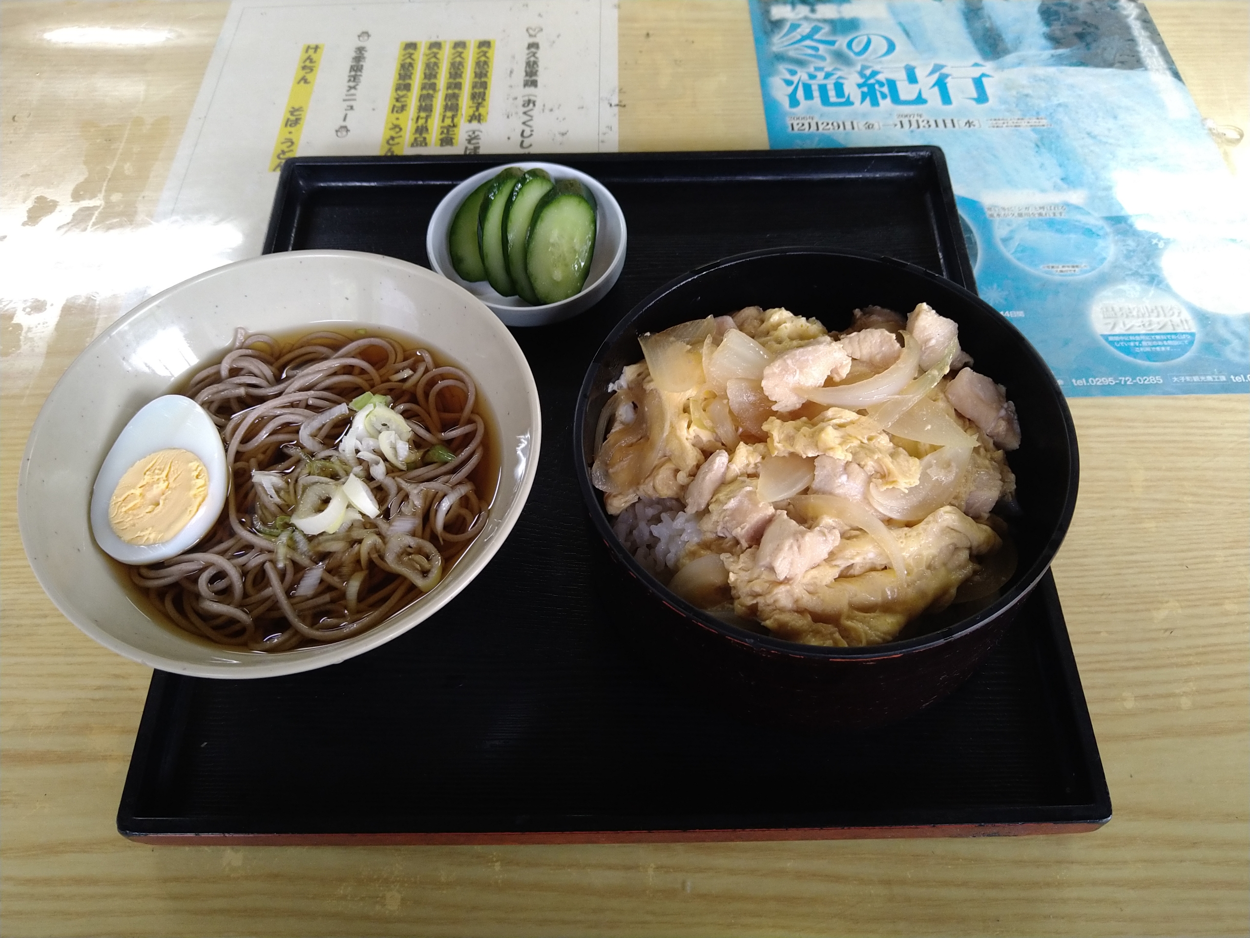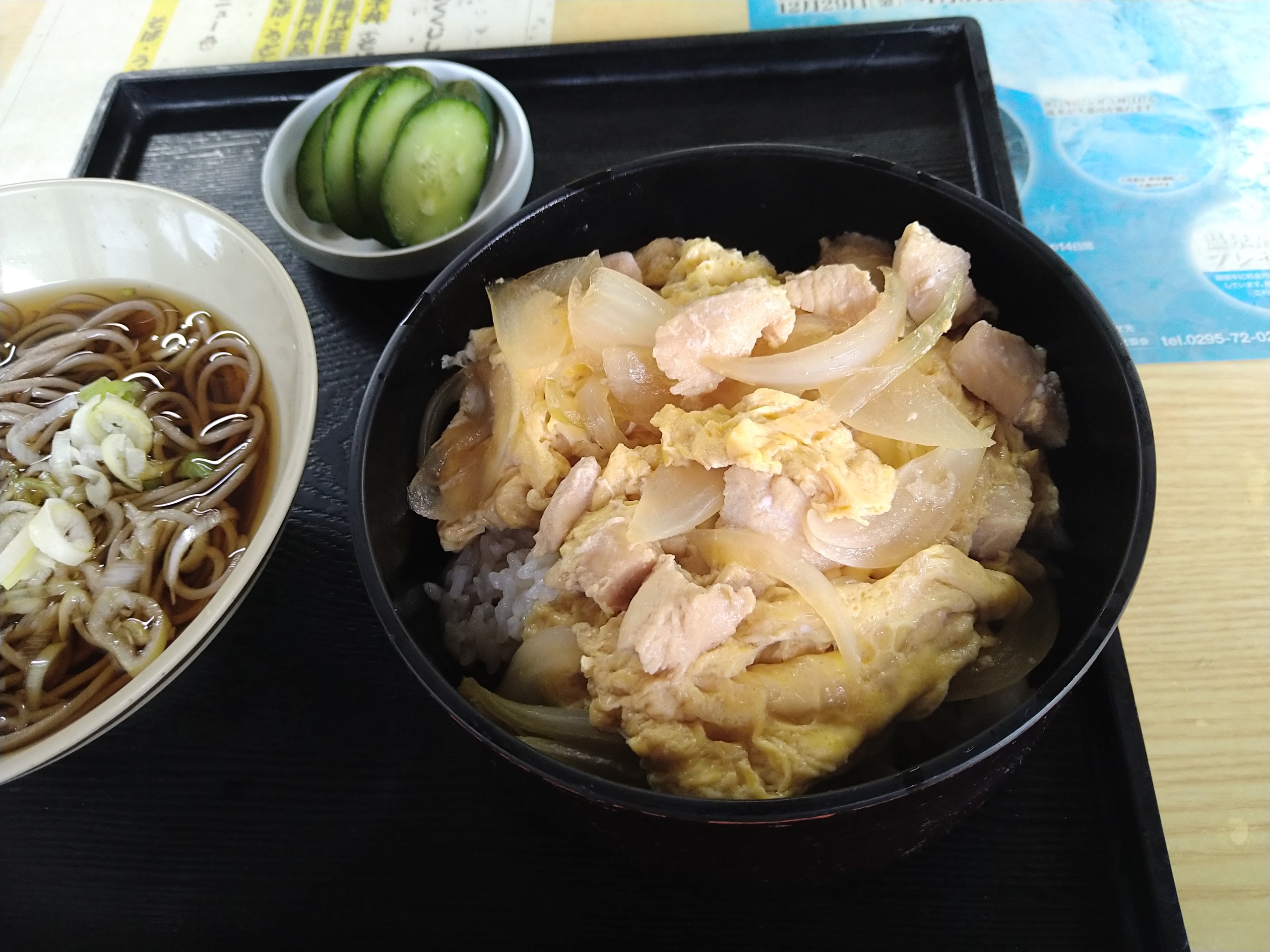 注文したのは奥久慈軍鶏親子丼(そば付き)(1000円)です。シンプルに軍鶏親子丼に蕎麦・漬物が付いていました。蕎麦はつゆに浸ってますが、冷たい蕎麦で具はネギとゆで卵でした。蕎麦の具にゆで卵は初めてでしたが、私的には合わないと思いました。蕎麦は至って普通でした。