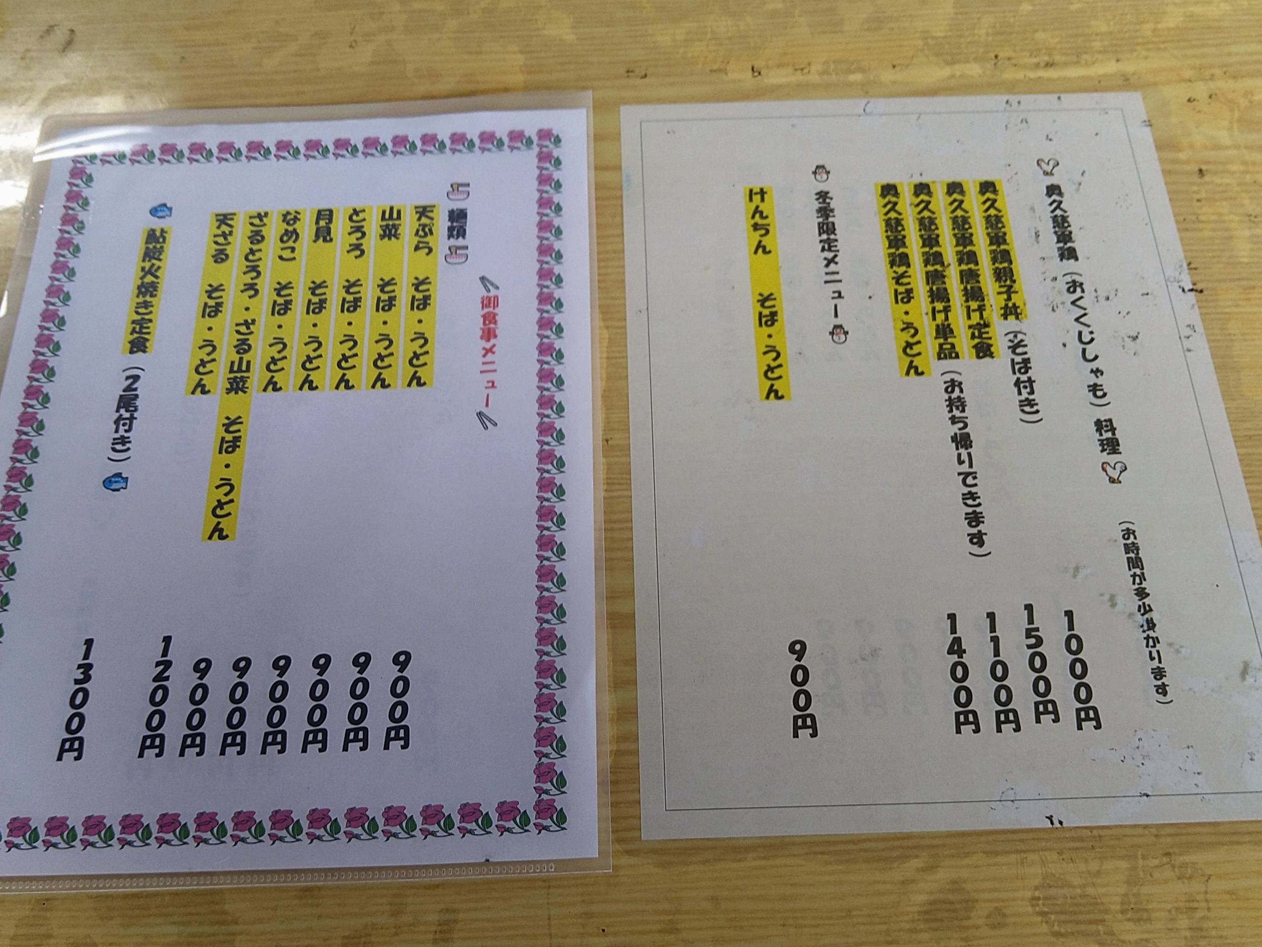 お店のメニューです。奥久慈しゃもを使った丼や唐揚げ・うどん・蕎麦がウリですが、その他に鮎の炭火焼き定食や各種うどん・蕎麦があり、季節でけんちんもやってるみたいです。