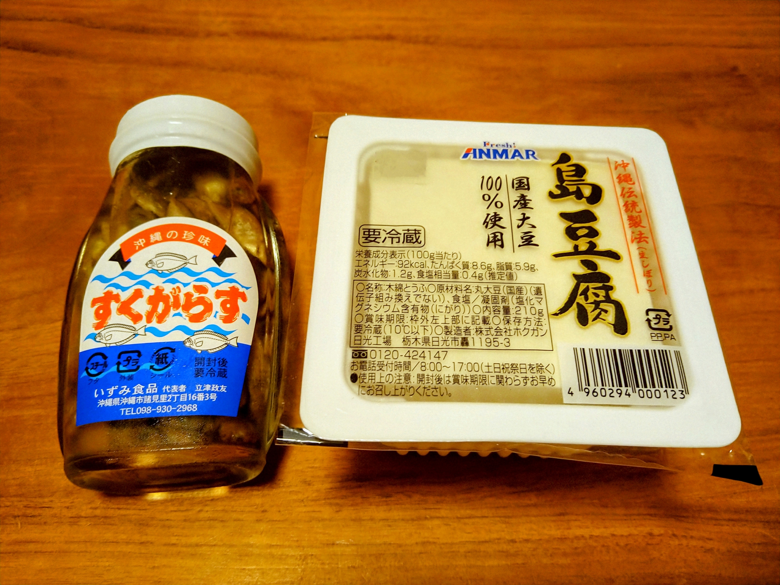 今日の酒の肴は沖縄市のいずみ食品が製造する沖縄の郷土食で発酵食品でもあるスクガラスと栃木県日光市のホクガンと言う会社が沖縄伝統製法で製造した島豆腐です。
