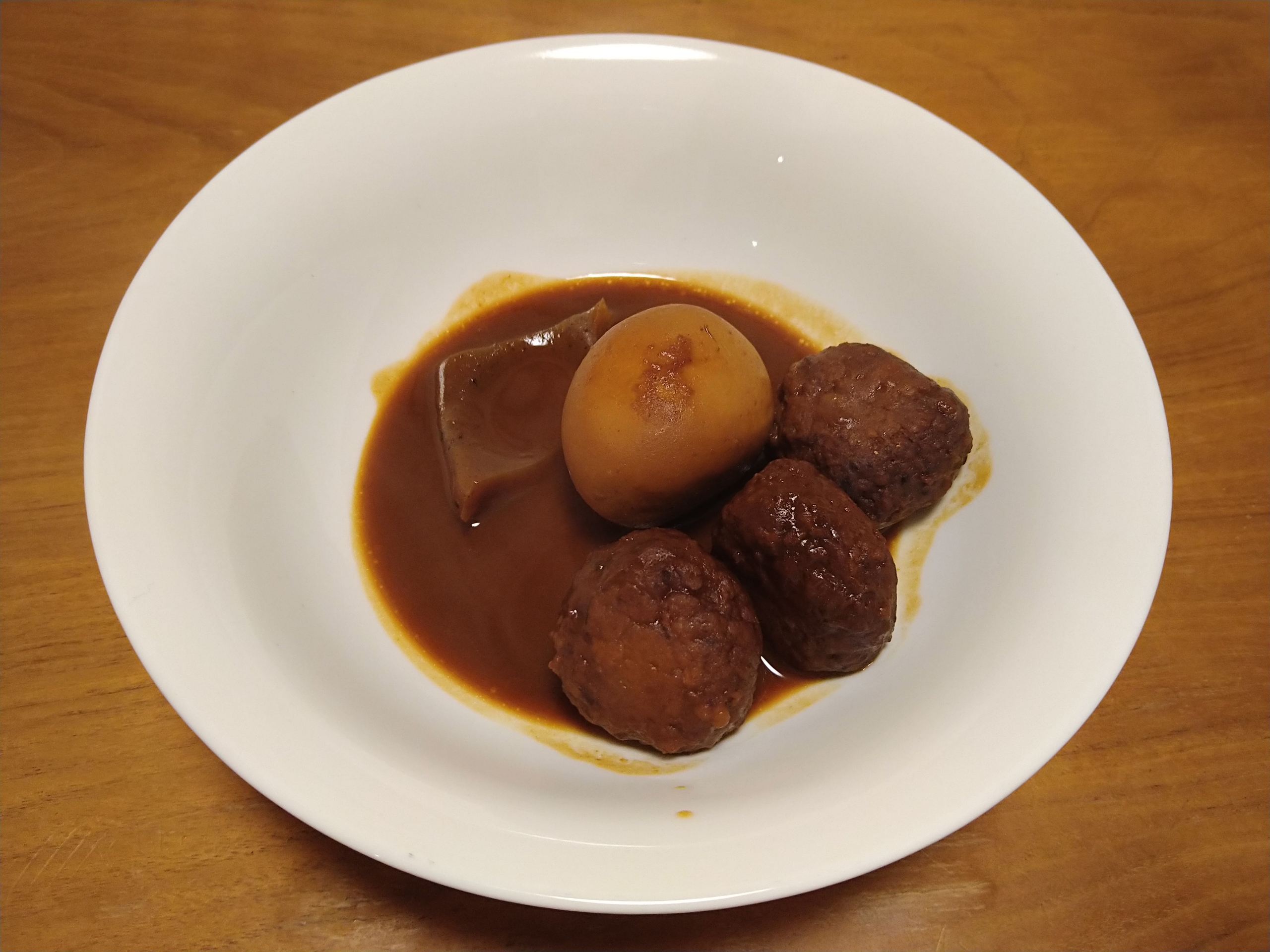 袋ごとレンチンして器に取り出すと、第一印象 少な!食べた感想はつくねは旨味と脂があって柔らかく、どて味噌の味が染みてて美味しかったです。玉子はパサパサ感が気になるが普通に美味しかったです。申し訳なさそうに入ってる薄くて小さなコンニャク一枚は少なすぎて微妙でした。つくねを増やすと値段が上がってしまいますが、ボリューム的にもコンニャクは安いからつくねと同じの3枚くらい入れて欲しいですね。