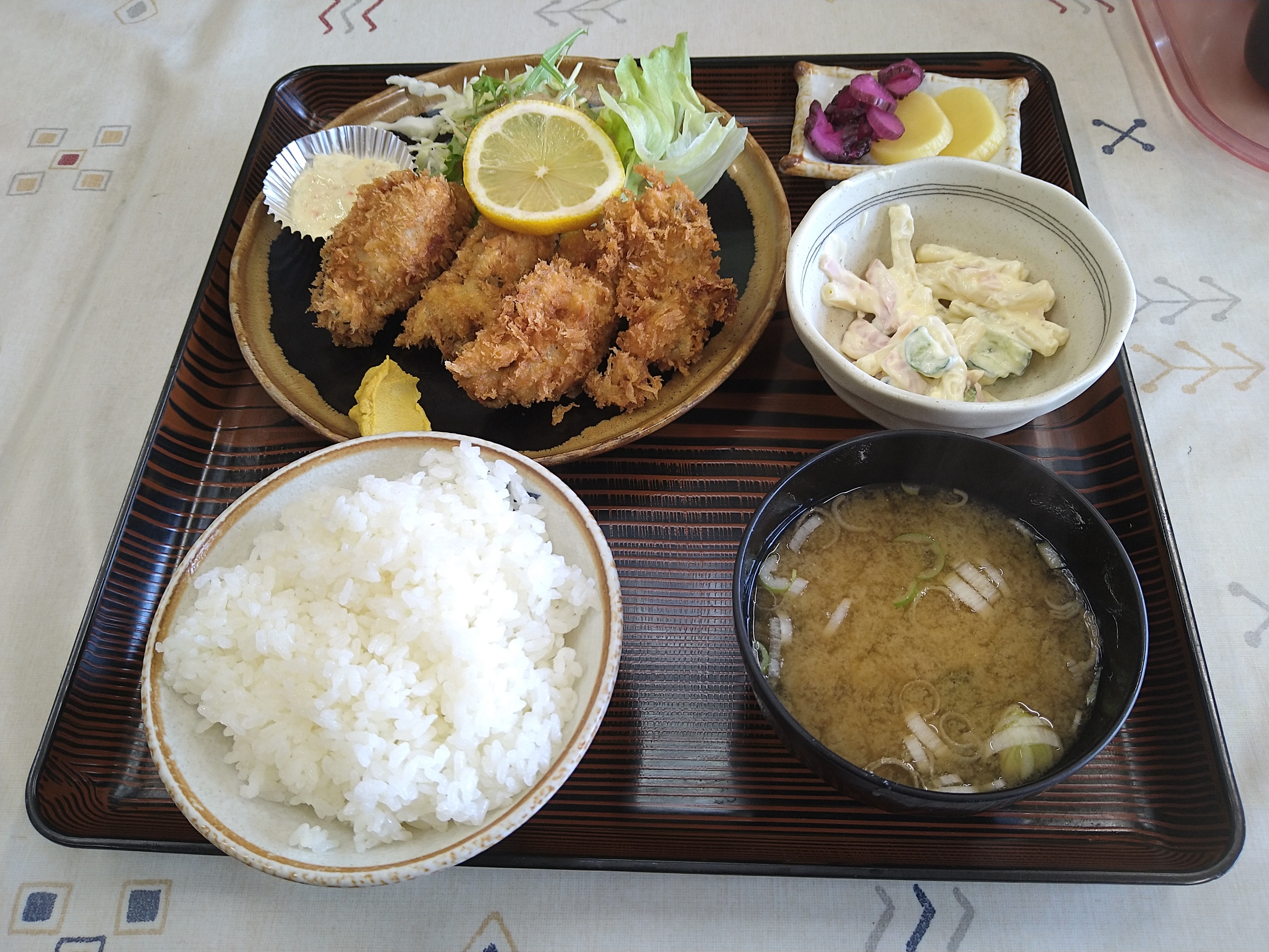 寒い中バイクで茨城まで来てお目当ての物が食べれなくて残念でしたが、気を取り直してカキフライ定食(1100円)を食べました。カキフライ定食はカキフライ4つに生野菜・マカロニサラダ・ご飯・味噌汁・漬物が付いています。