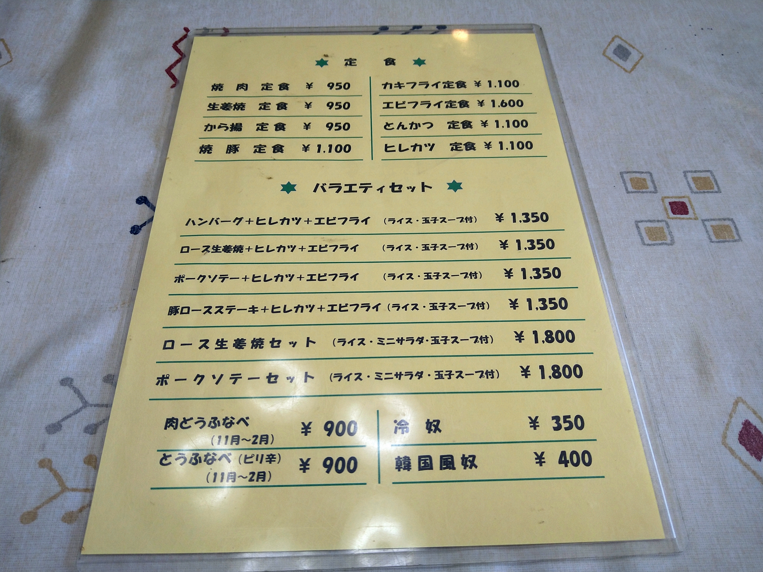 前回は焼肉定食を食べたんですが、その時にメニューを見て気になってたのが、冬季限定の「肉とうふなべ」です。前回は7月だったので食べれなかったので、提供時期に再訪して今回注文してみましたが、店のおばちゃん曰くメニューは書いてあるが、今は提供していないとの事。提供してないならメニューから消せよ!って感じですね。ドライブインや昭和の雰囲気の残る古びた食堂によくある、あるあるですね。こう言うケースは私は年に数回あるので、事前に電話で提供できるか聞いてから行くのがベストですね。今度から怪しいメニューはそうしよっと!