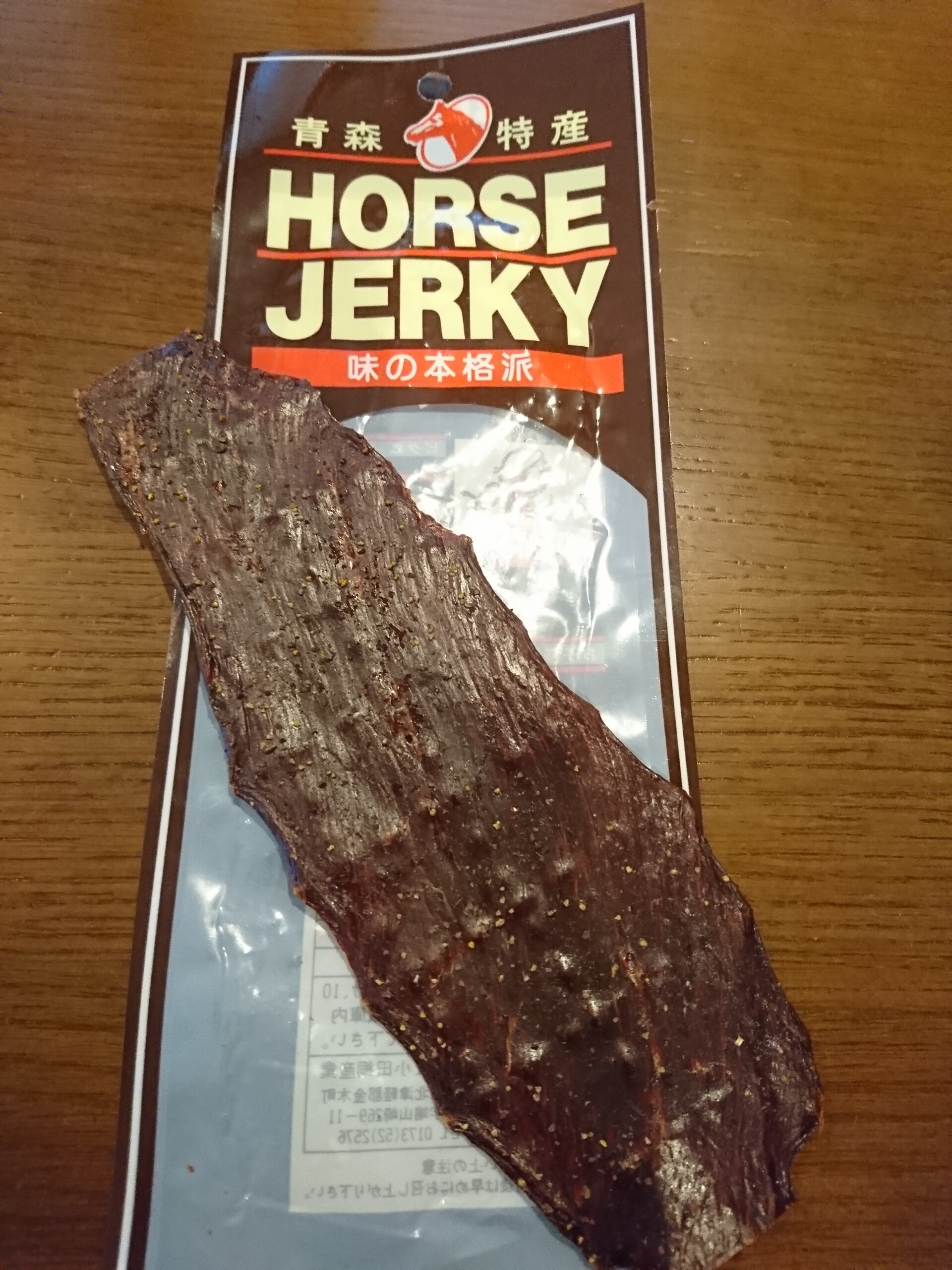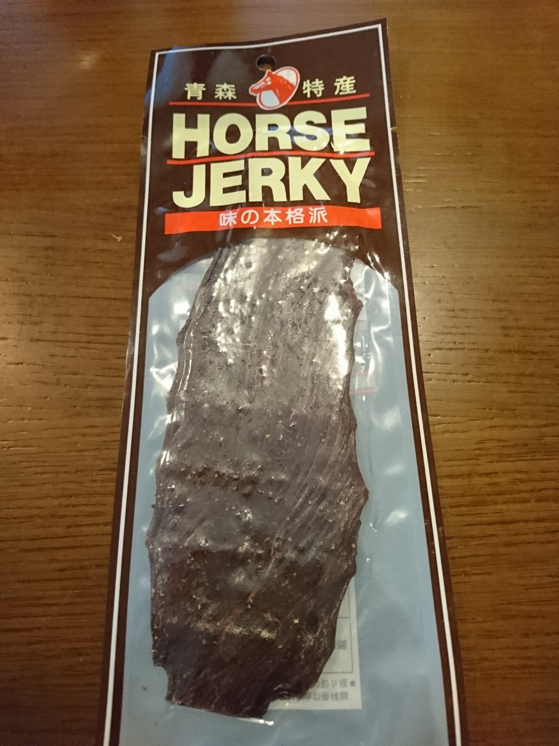 ホースジャーキーと言っても薄っぺらい馬肉の干物で、食べるとパリパリとした煎餅みたいな食感ですが、噛めば馬肉の旨味がじわーっと出てきてとても美味しかったです。