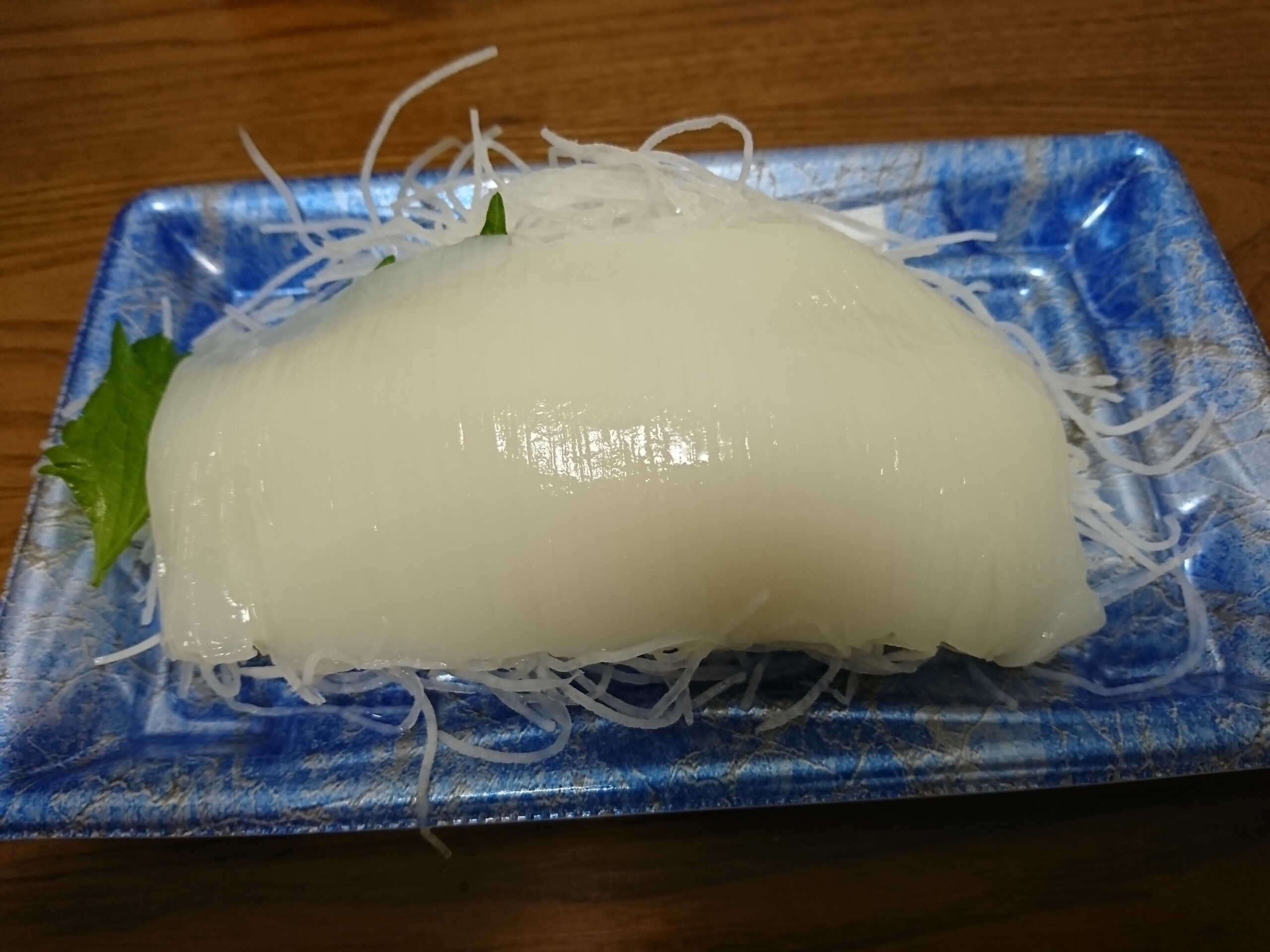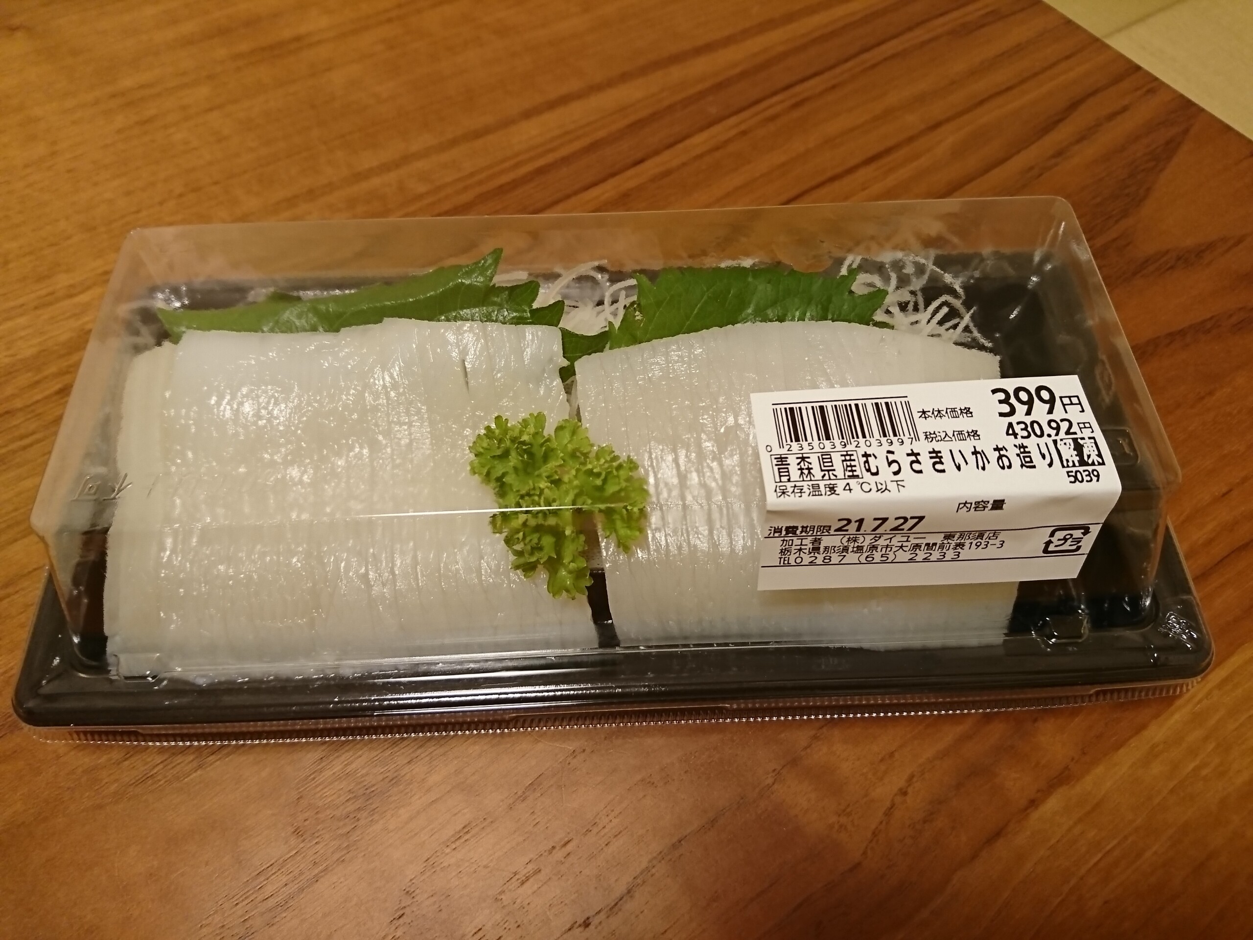 今日の酒の肴は近所のスーパーで買った、青森県産のむらさきいかの刺身です。