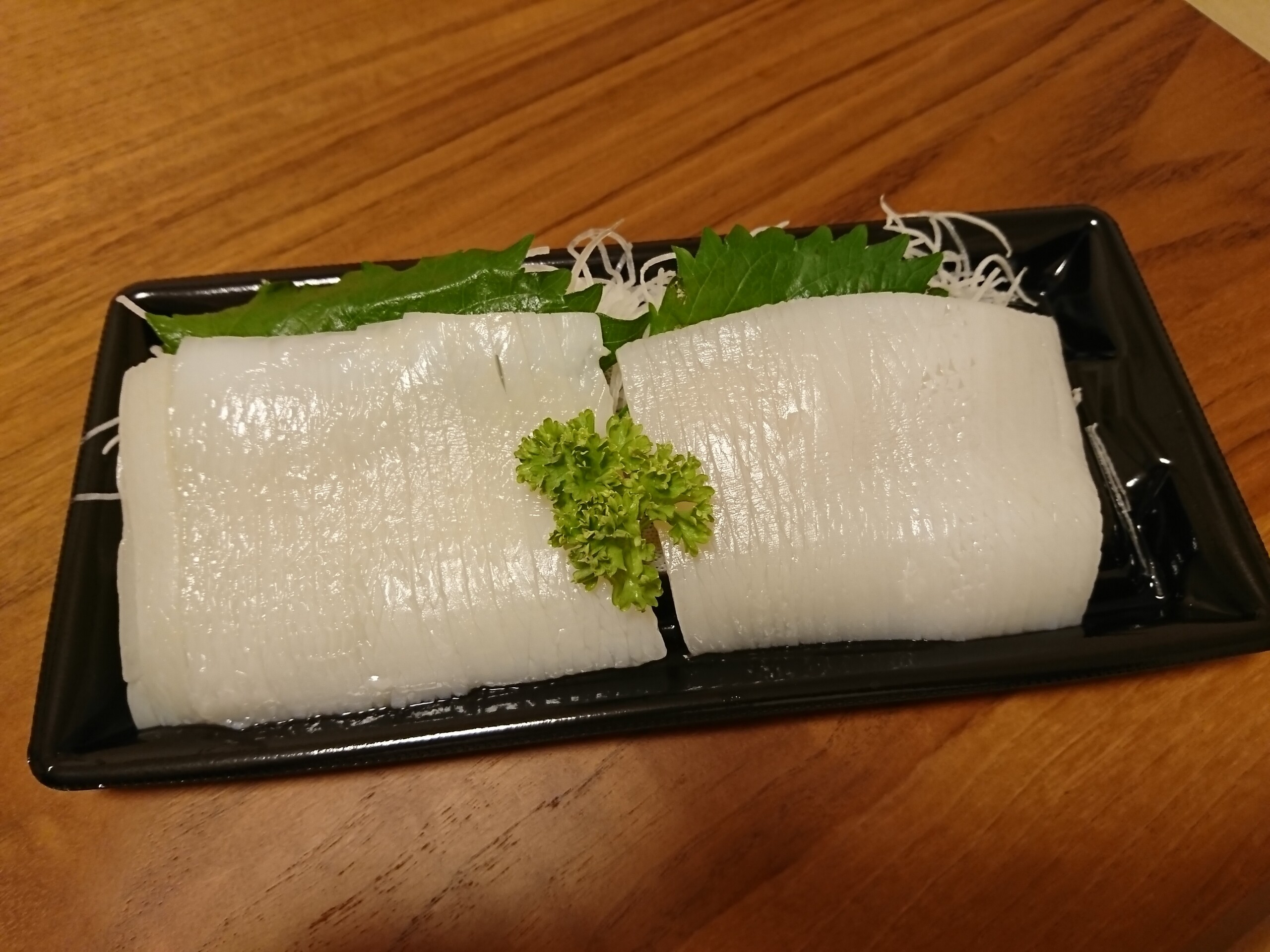 今日の酒の肴は近所のスーパーで買った青森県産の赤いかの造りです。