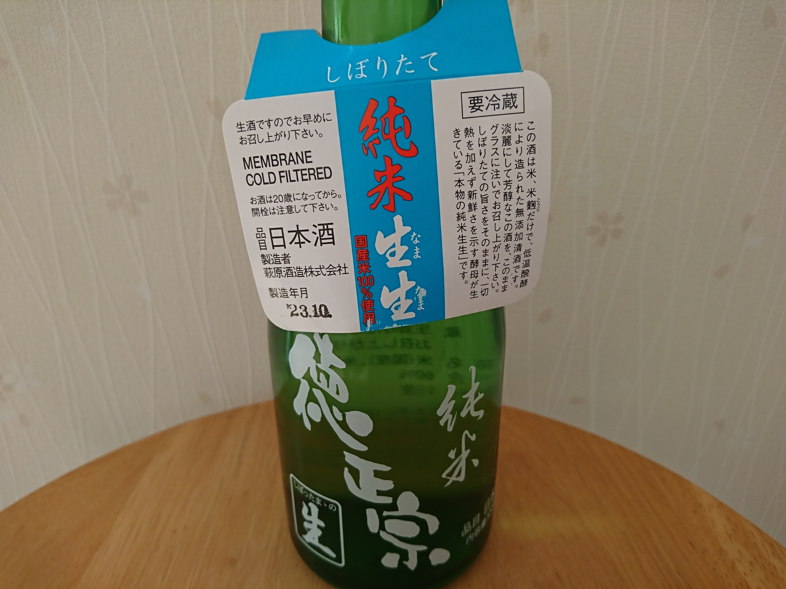 今日は茨城県行方市の道の駅たまつくりの行方市観光物産館こいこいで510円で購入した、境町の酒蔵・萩原酒造の酒「徳正宗・純米生酒」を冷酒で飲みました。酒は精米歩合60%と純吟並みに削り込んだ米を使用した、しぼりたての純米酒で火入れを一切してない生酒です。飲んだ感想は淡麗のちょっと苦辛い酒でしぼりたての生酒独特の麹バナはほとんど感じられないのは気のせいか?あまりフレッシュ感はありませんが適度な旨味があって結構美味しかったです。